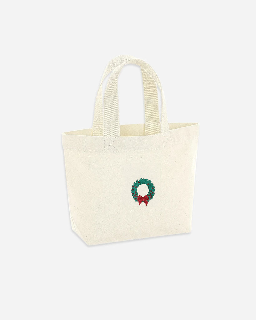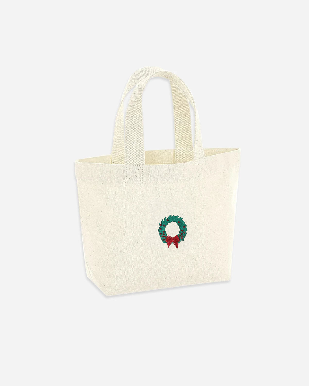 Faites entrer la magie de Noël dans vos petits cadeaux avec notre mini tote bag brodé “Couronne de Noël”.