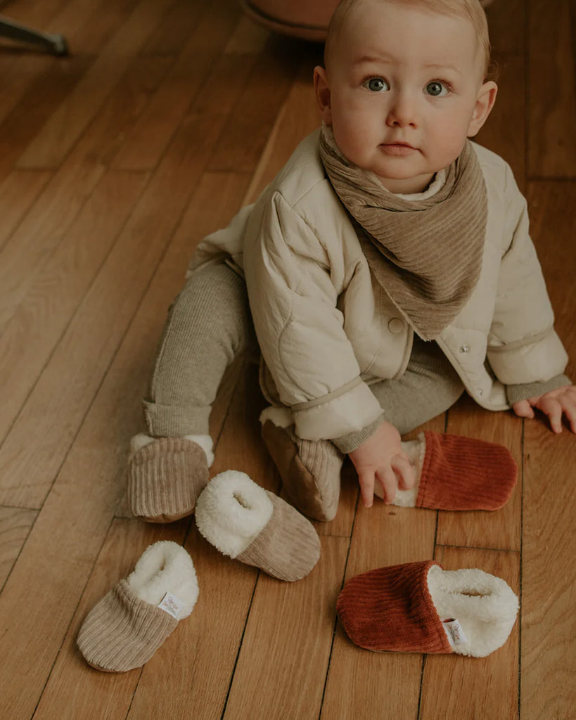 Craquez pour nos chaussons en velours taupe, fabriqués à la main en France à partir de matériaux de qualité et sans substances chimiques. Ces chaussons côtelés sont idéaux pour garder les petits pieds de votre bébé bien au chaud tout en l’accompagnant dans ses premiers pas. Parfaits pour un élégant et confortable