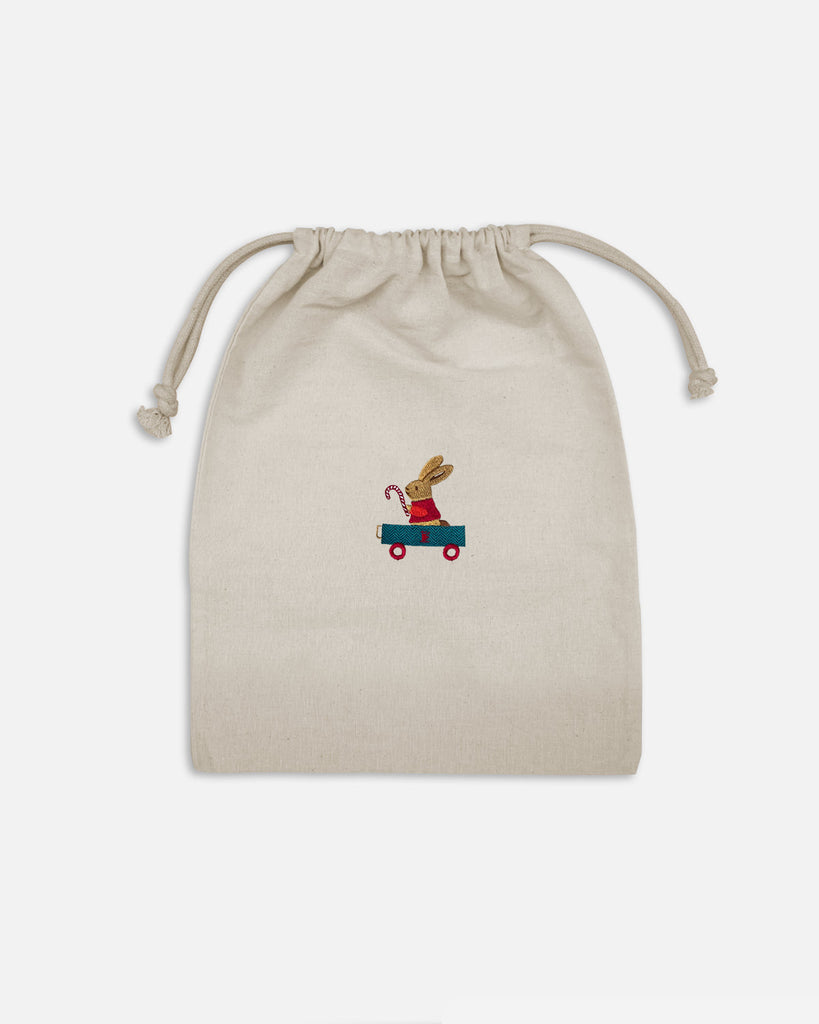 Cette pochette en coton naturel, brodée d’un petit lapin emmitouflé dans sa cariole, transporte toute la douceur des fêtes. Parfaite pour glisser un cadeau, un doudou ou une petite surprise, elle ajoute une note poétique et responsable à vos présents. Réutilisable, douce et élégante, elle incarne l’esprit tendre et raffiné de Bobine Paris.