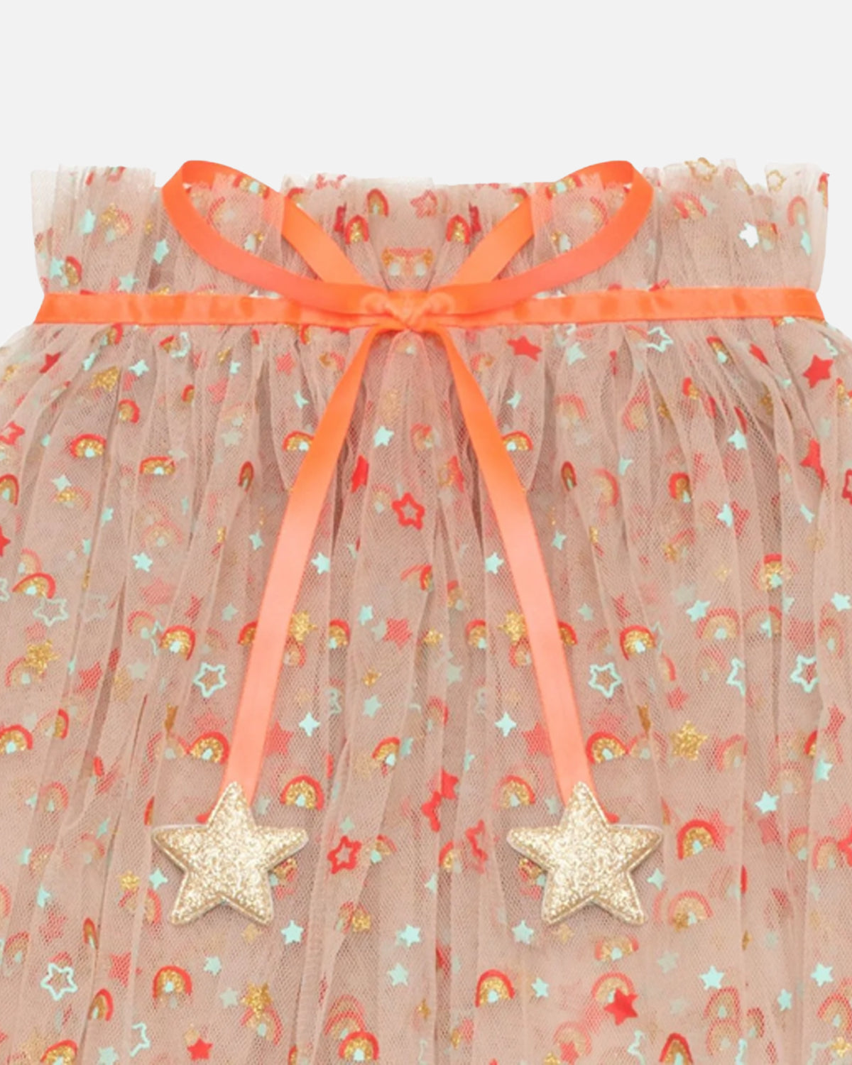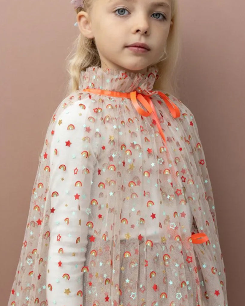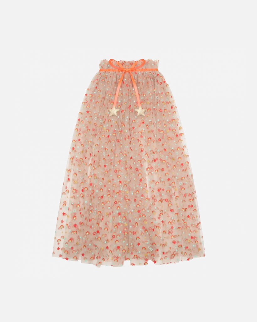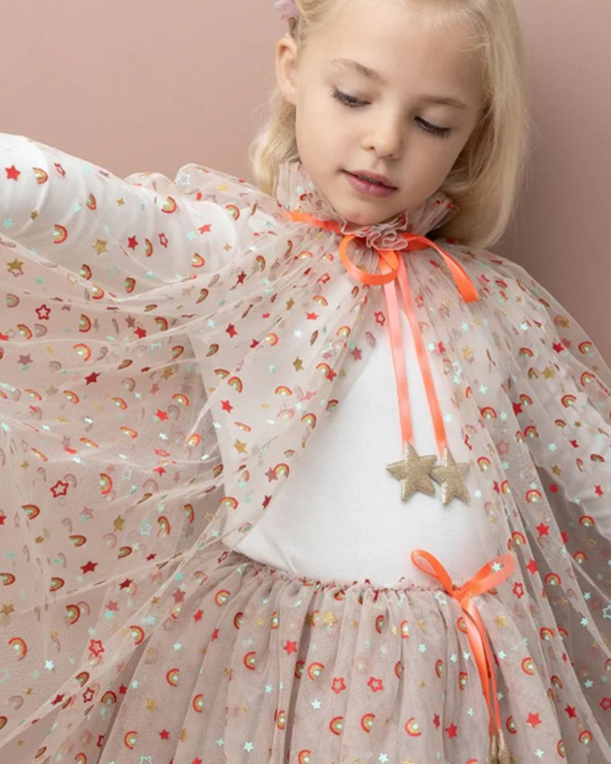 Pluie d’étoiles et arcs-en-ciel au rendez-vous ! Cette cape en tulle beige parsemée de petits motifs colorés fera rêver les enfants.