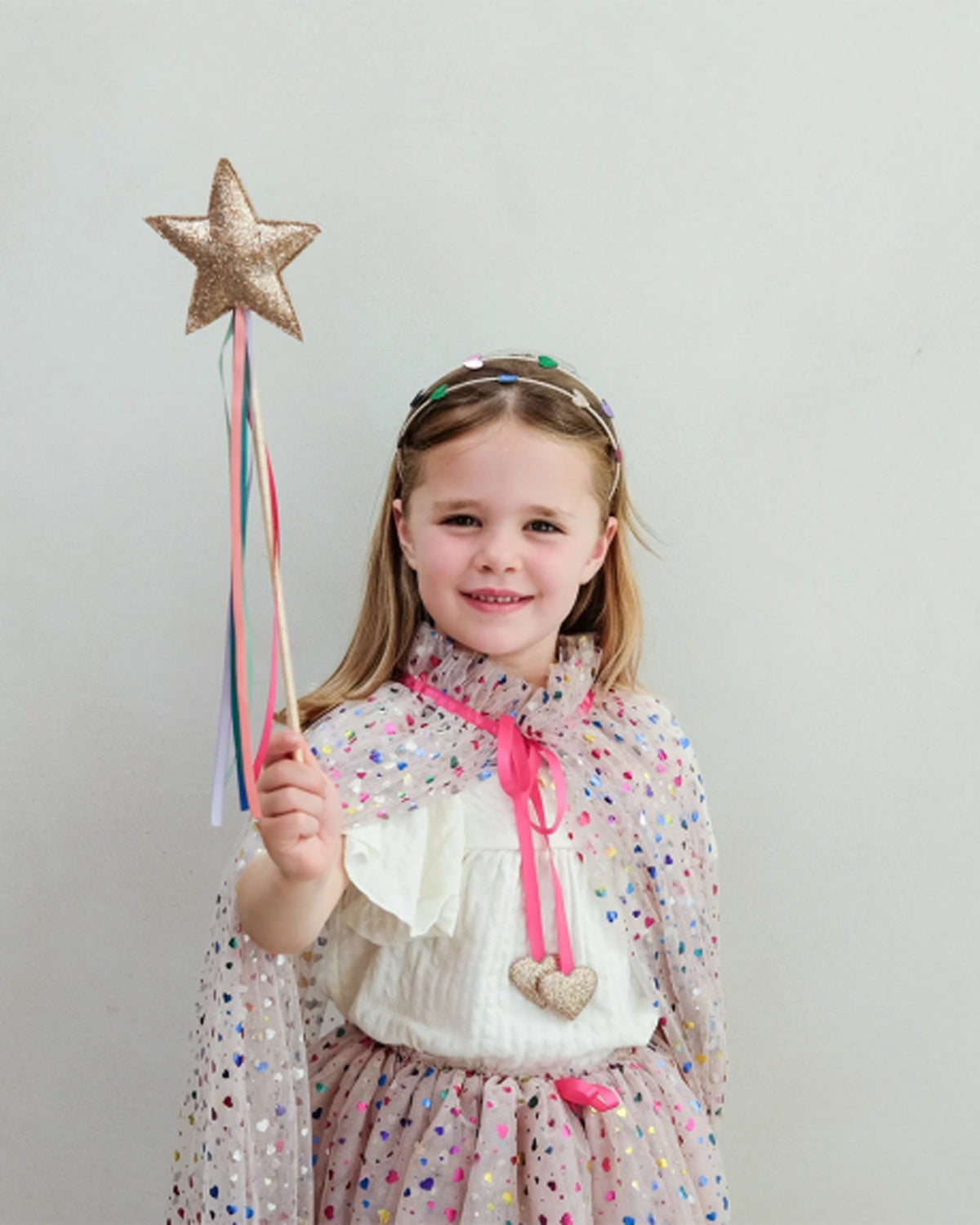 Son ruban rose vif et ses cœurs dorés apportent la touche finale parfaite pour un look de princesse, de fée ou de super-héroïne colorée.