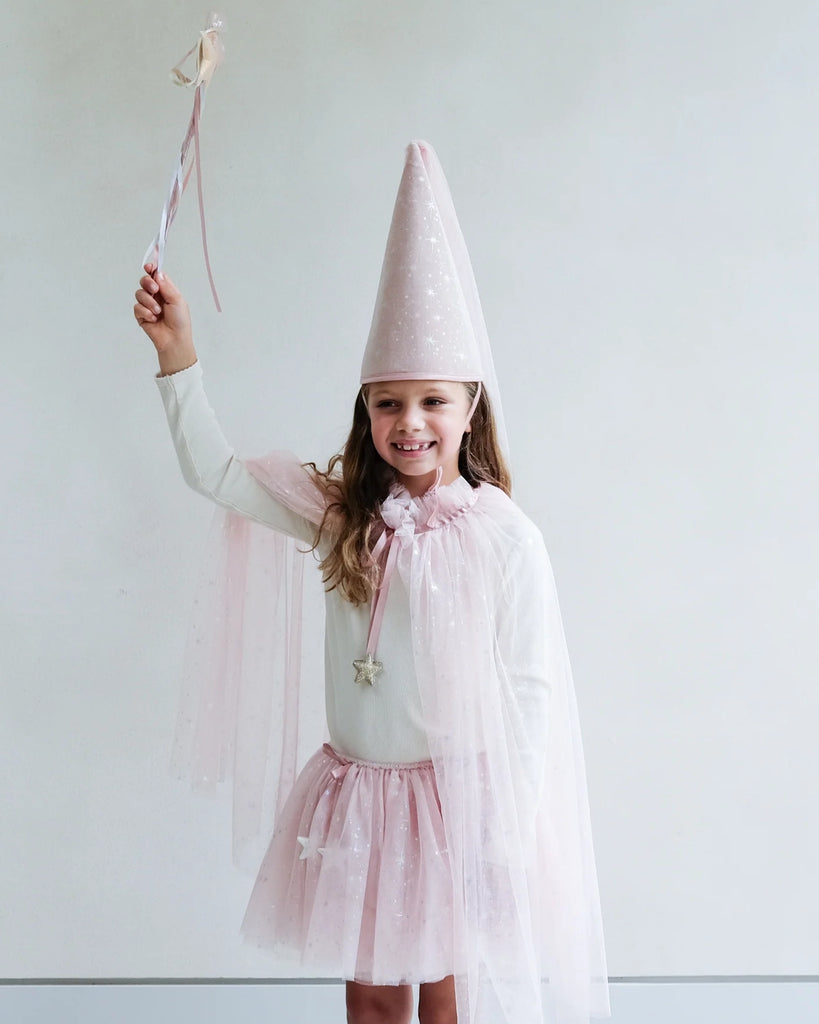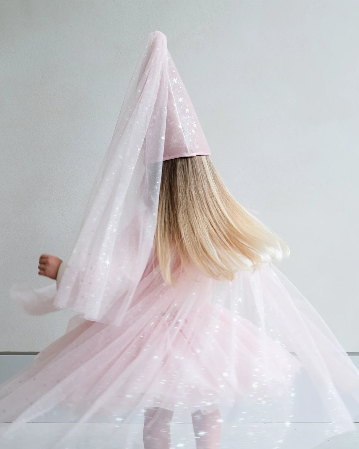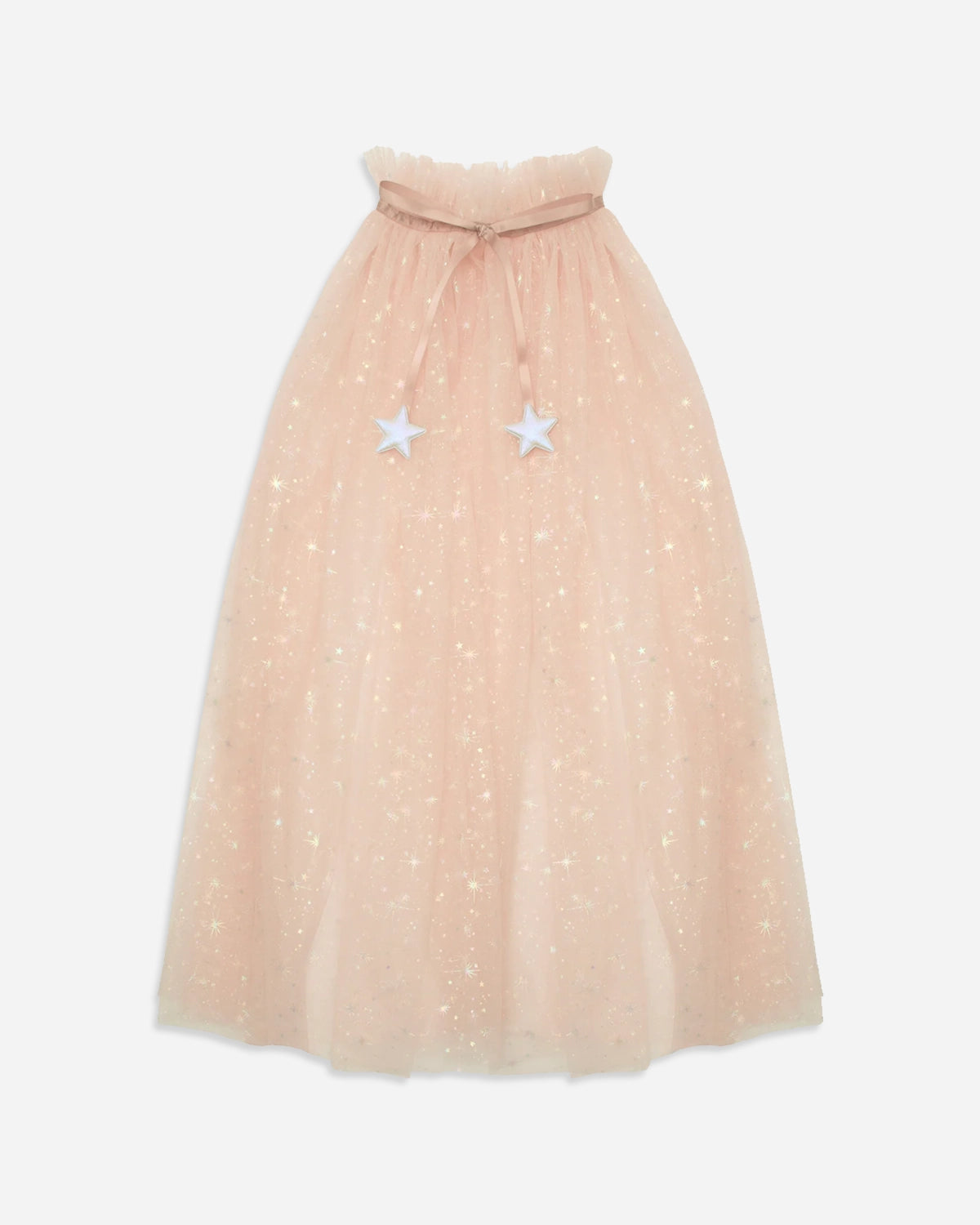 Parée de constellations dorées étincelantes, cette cape en tulle rose tout doux transporte les petits rêveurs dans un univers magique et étoilé.