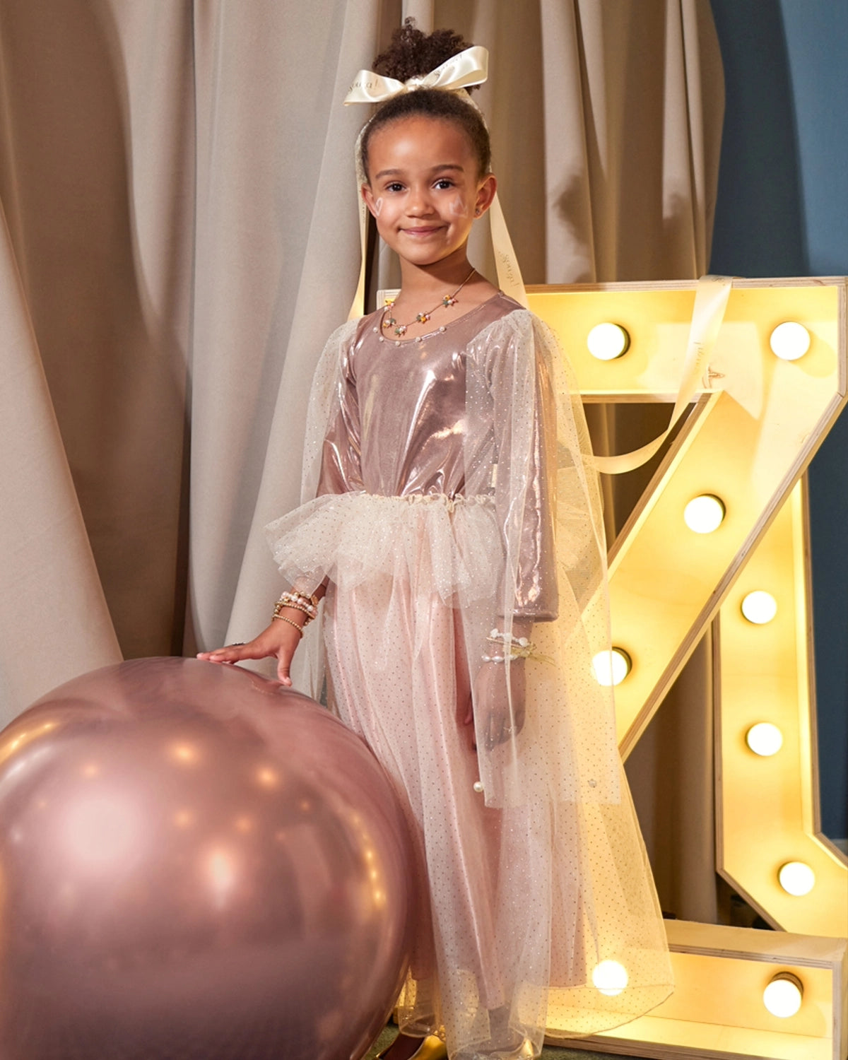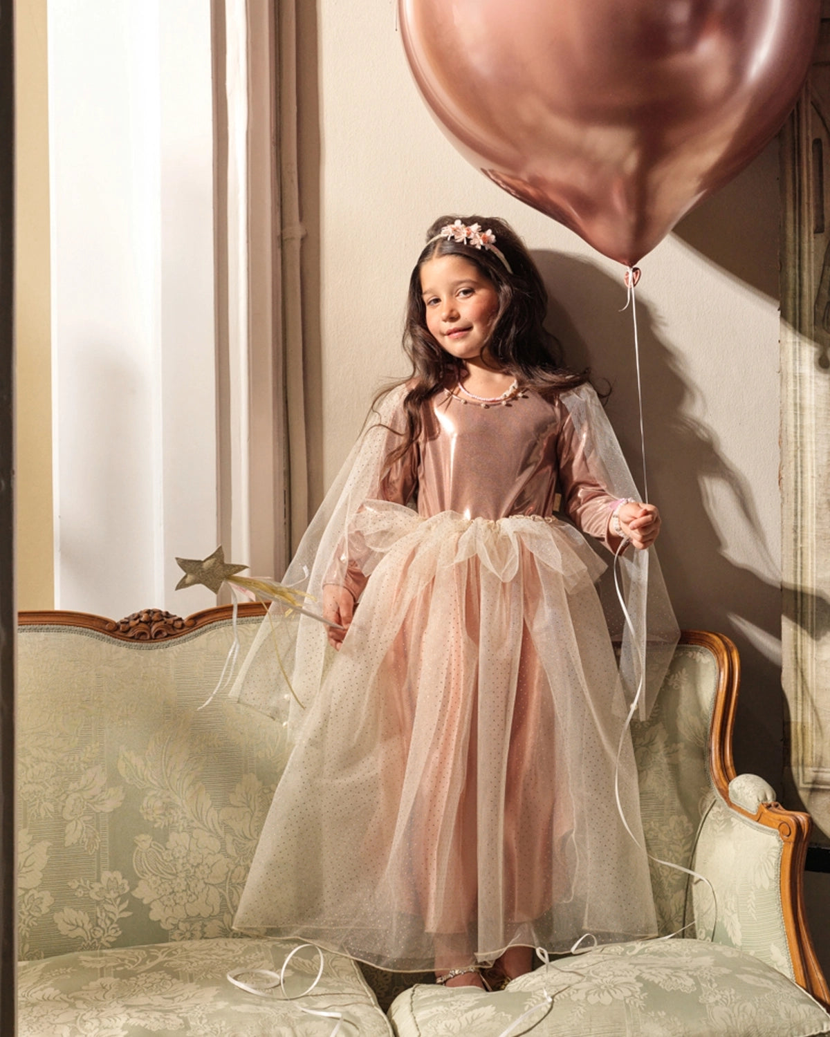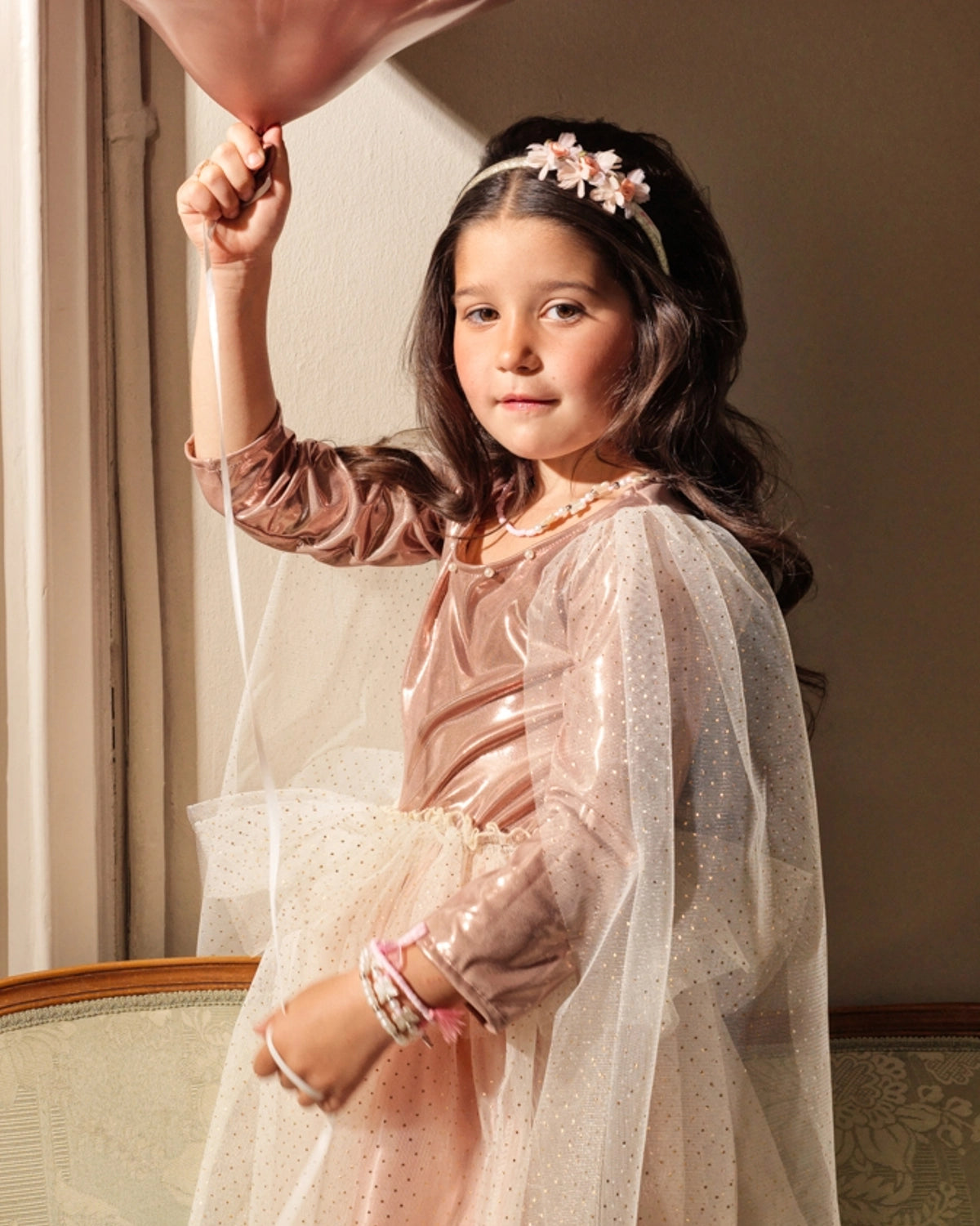 Laissez la magie opérer avec la robe de princesse Amalia. Son bustier rose métallisé apporte une touche éclatante, tandis que ses longues manches en tulle pailleté créent un effet léger et féerique à chaque mouvement. La jupe ample, composée de plusieurs couches de tulle rose poudré, offre un volume majestueux parfait pour tourbillonner comme dans un vrai conte de fées. Élégante, lumineuse et confortable, cette robe est idéale pour les anniversaires, les fêtes, les spectacles ou les jeux imaginaires. Avec Amalia, chaque enfant devient la reine de sa propre histoire
