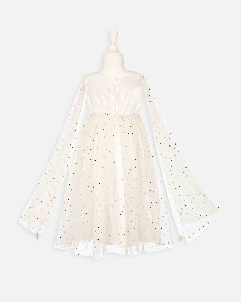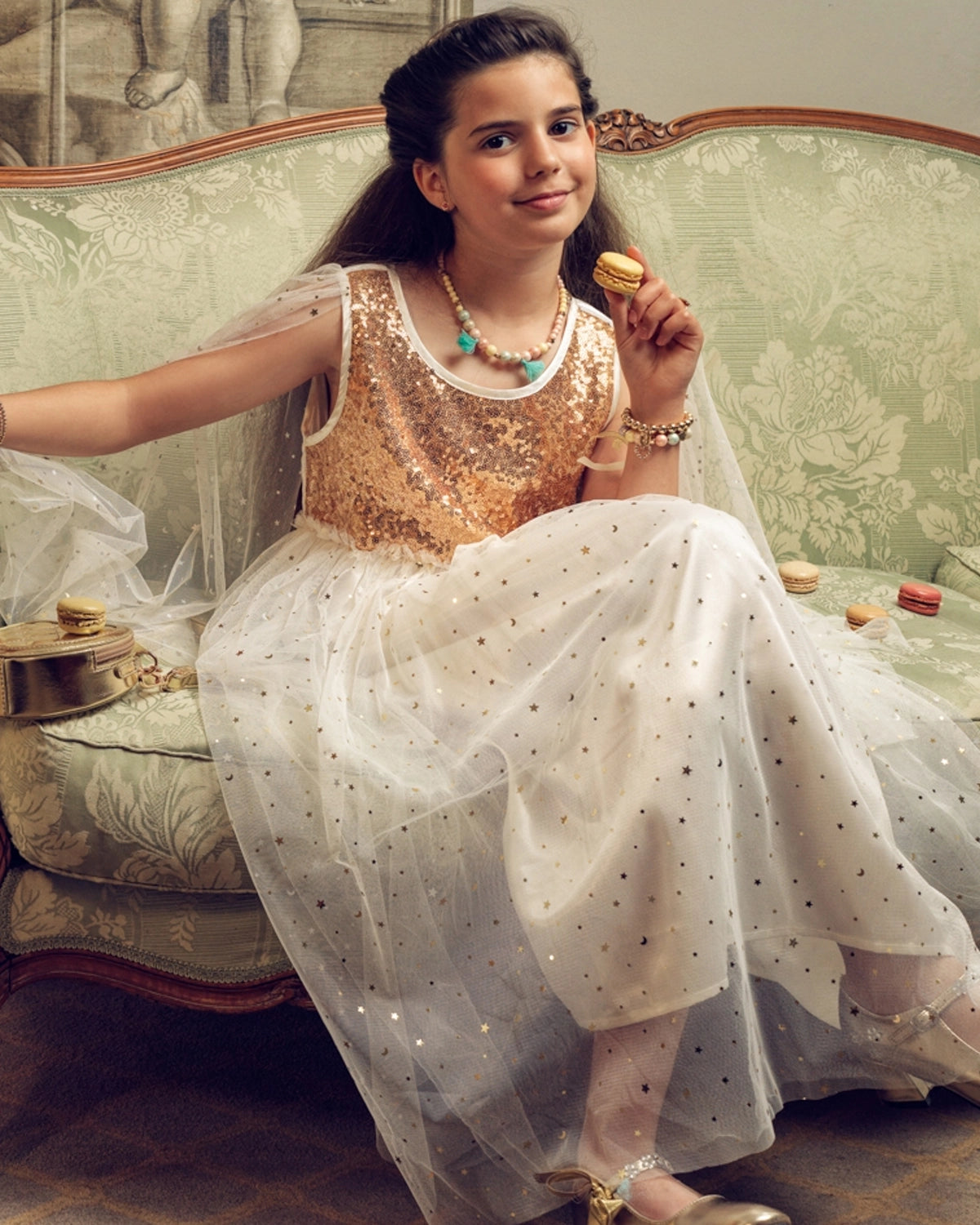 L a robe Princesse Dalia transforme chaque petite fille en véritable héroïne de conte de fées. Son bustier scintillant couvert de sequins dorés capte la lumière à chaque mouvement, tandis que sa jupe vaporeuse en tulle étoilé offre une allure féérique.