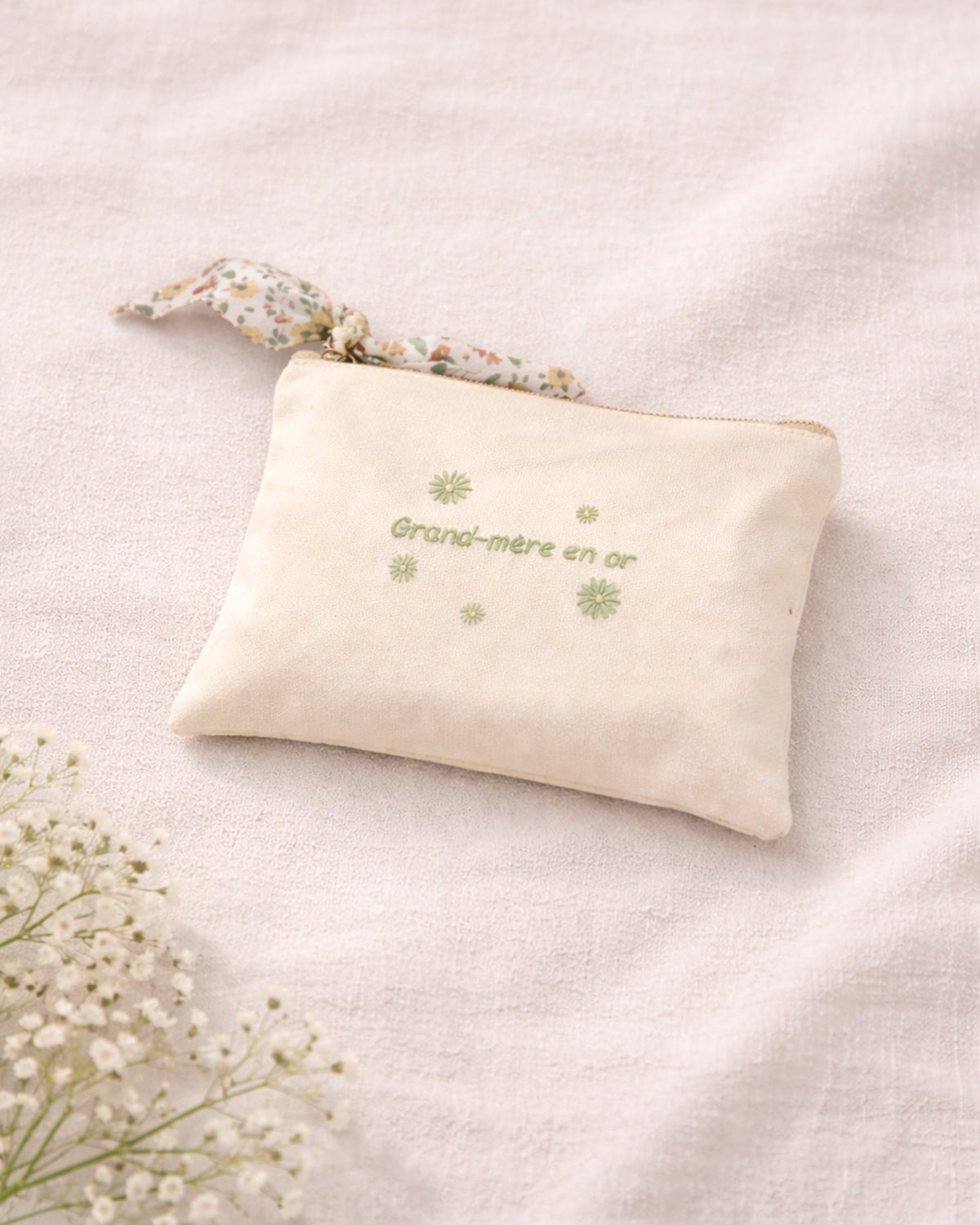 Cette délicate trousse en tissu écru est le cadeau parfait pour célébrer une grand-mère exceptionnelle. Alliant praticité et tendresse, elle saura l'accompagner au quotidien avec style.