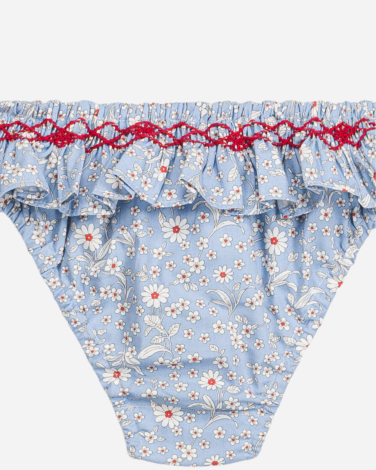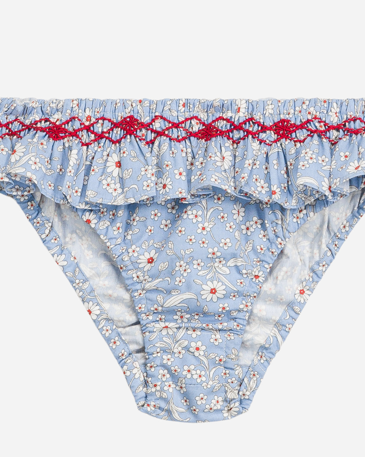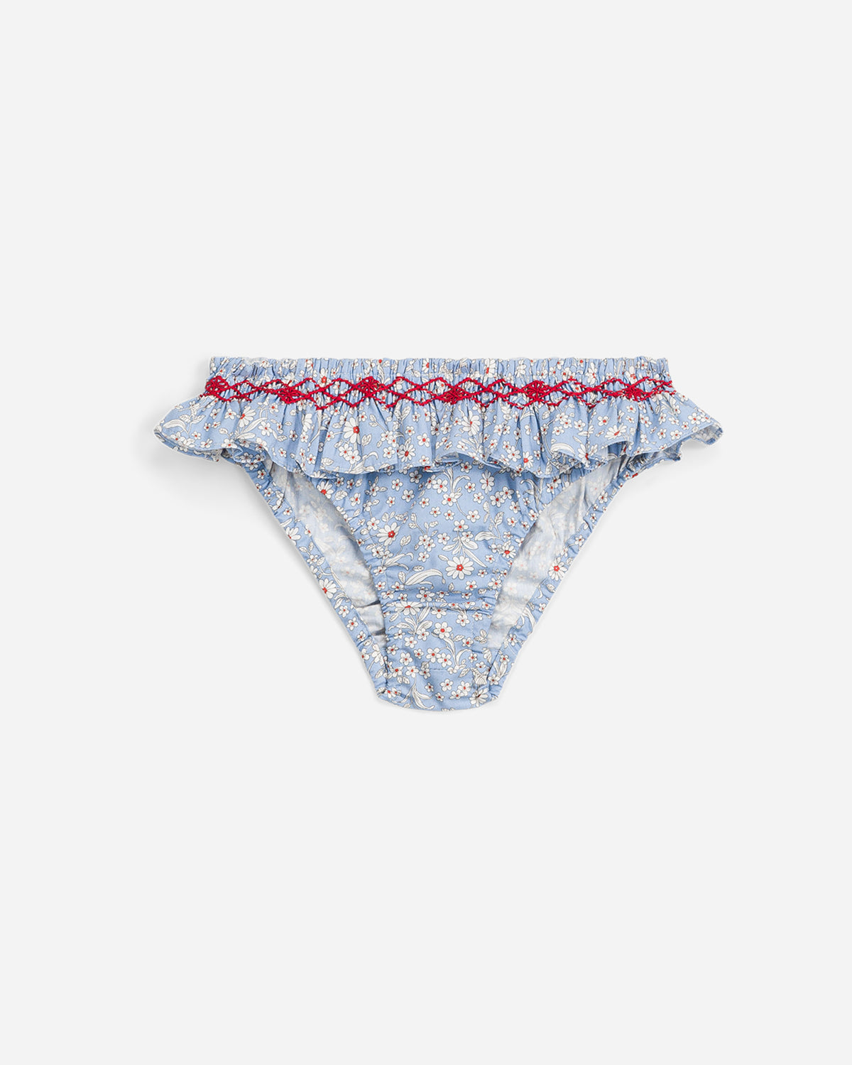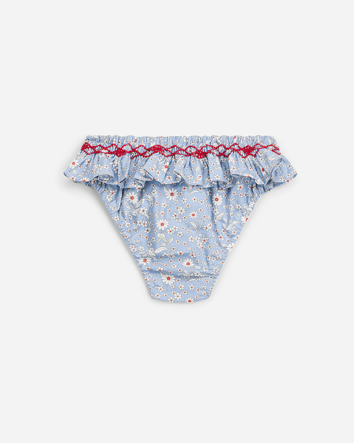 Ce bas de bikini pour bébé charme par son imprimé fleuri aux tons bleu et rose, délicatement contrasté par une broderie rouge à la taille. Sa coupe confortable est sublimée par un joli volant et une finition smockée qui assurent un maintien doux, parfaitement adapté aux tout-petits.