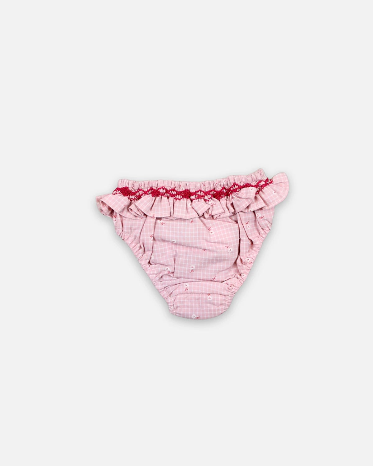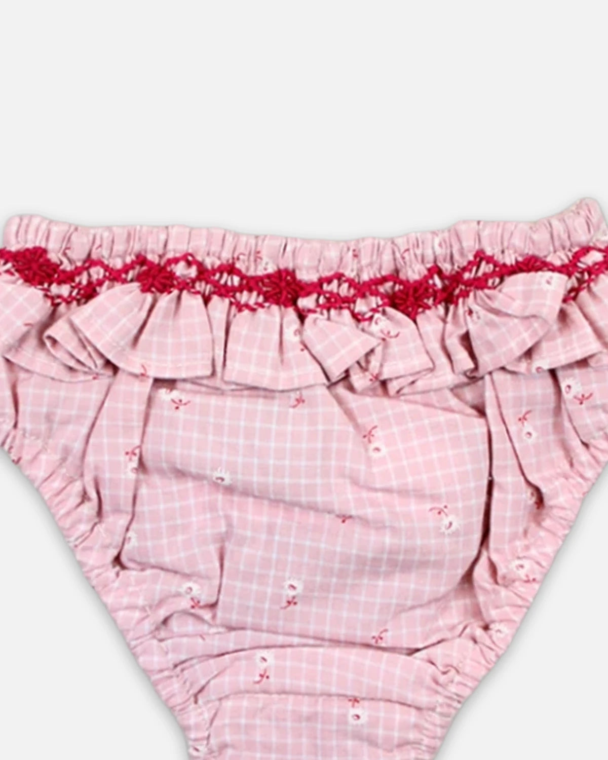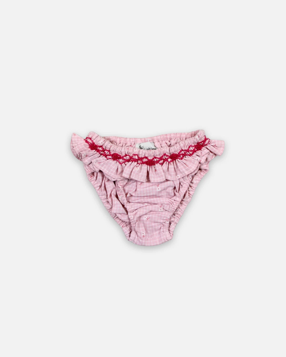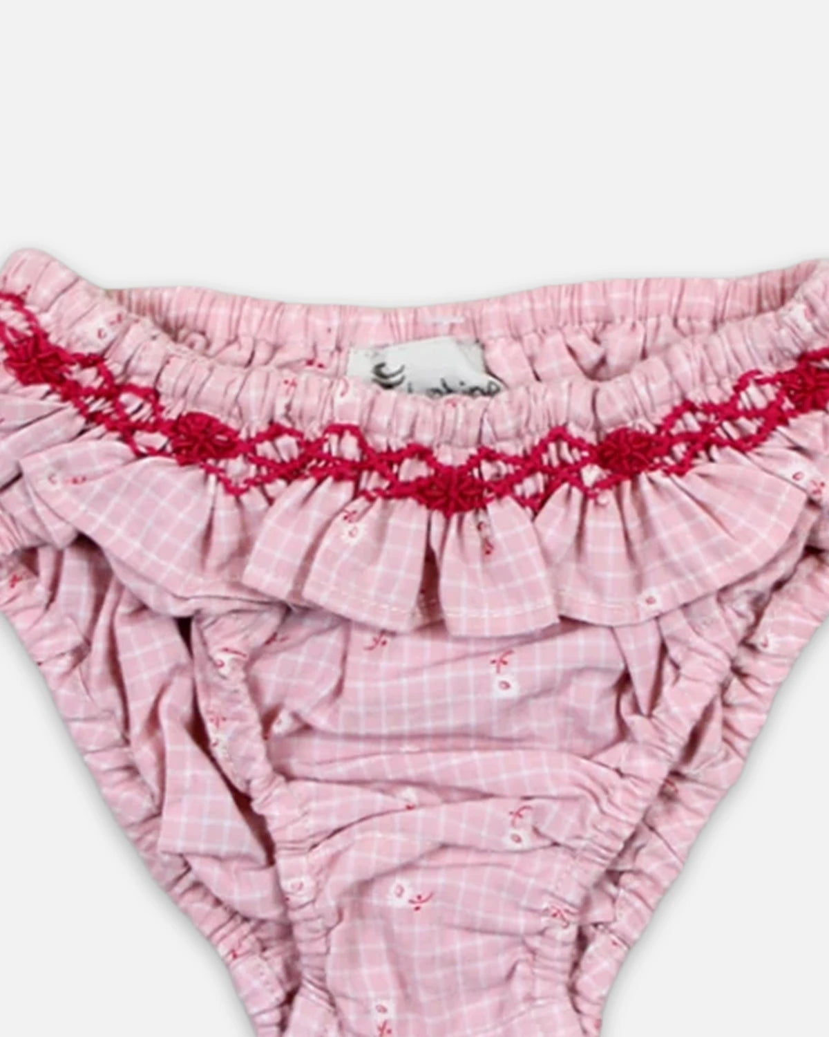 Ce bas de bikini pour bébé séduit par son imprimé fleuri aux tons rose, évoquant la douceur et la gaieté de l’été. Sa coupe confortable est mise en valeur par un joli volant à la taille et une finition brodée délicate qui apporte une touche raffinée et féminine.