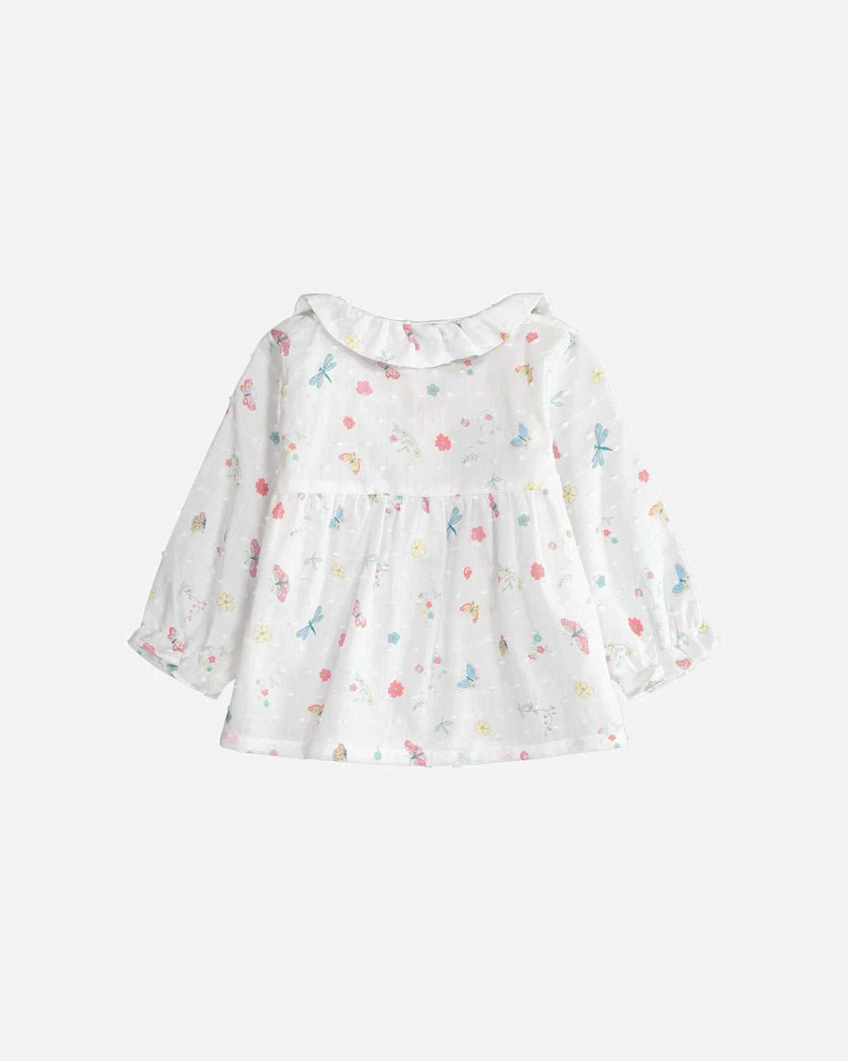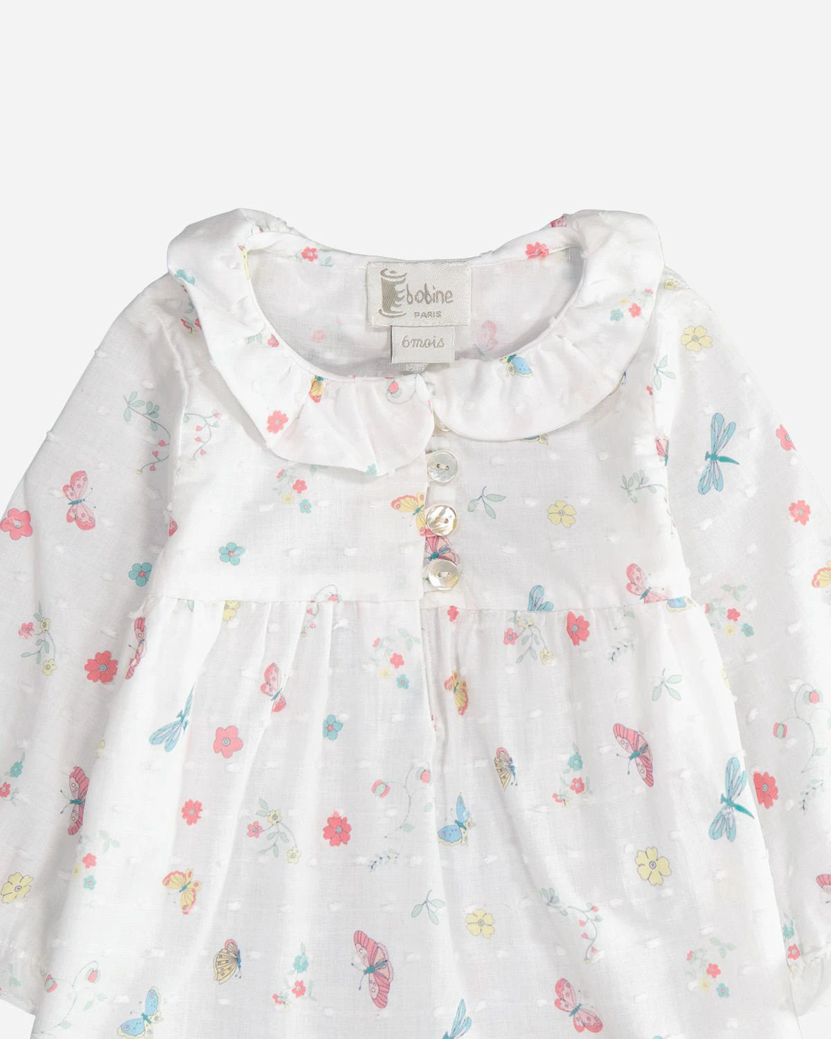 La blouse manches longues Ava pour bébé fille, fabriquée en coton Oeko-Tex, offre un charmant volume. Son tissu plumetis blanc est orné de motifs floraux multicolores adorables. On apprécie les détails de son col claudine et de ses bas de manches élastiqués.