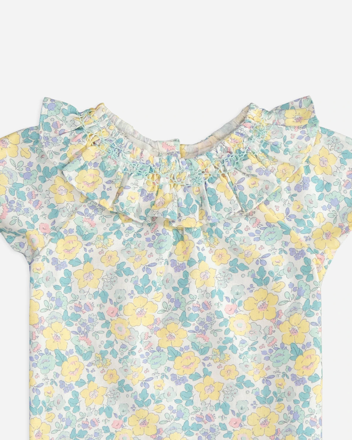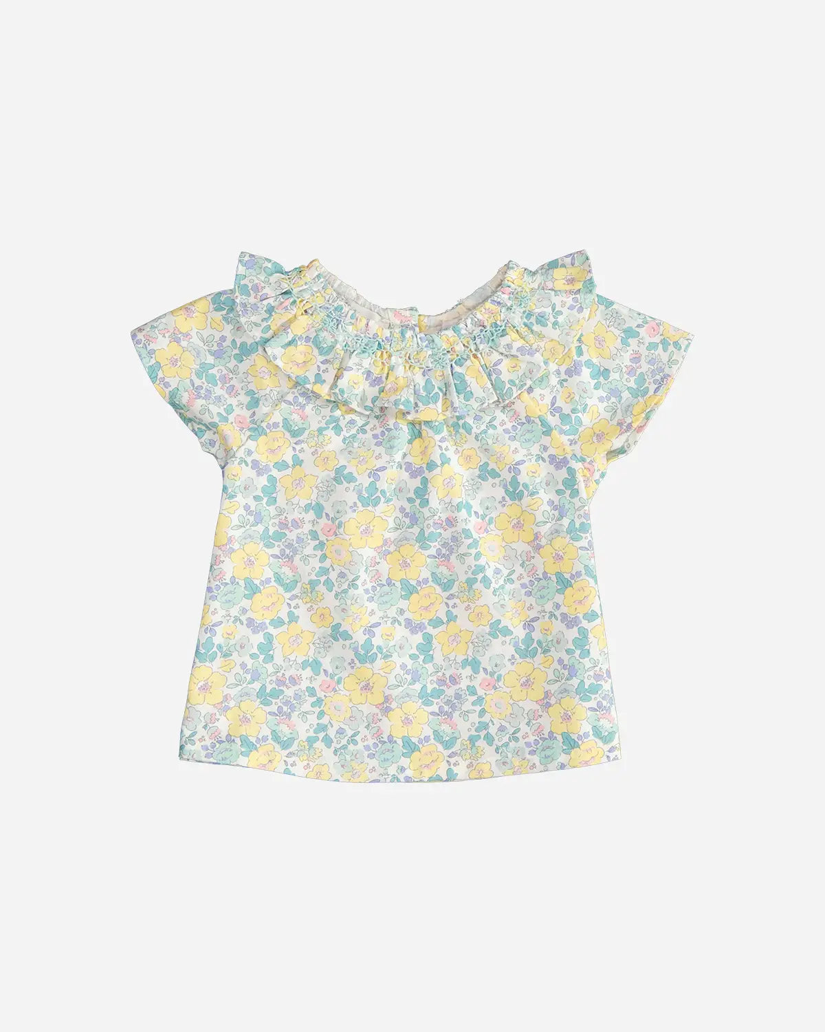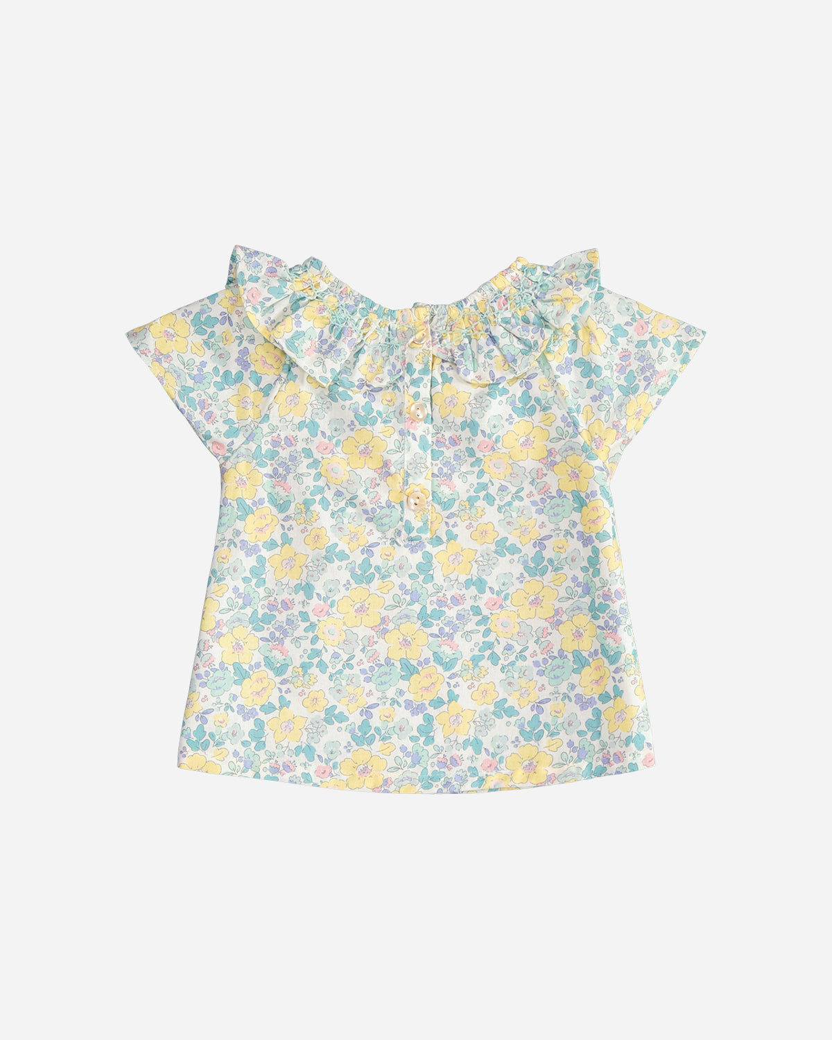 Craquez pour la blouse à manches courtes Joana, ornée d'un motif à fleurs couleur émeraude et jaune, spécialement conçue pour les bébés filles. Ses manches volantées et sa coupe évasée offrent une combinaison parfaite entre élégance, confort et légèreté. Cette blouse ajoutera une touche d'éclat à la garde-robe de votre petite fille, tout en restant pratique et confortable grâce à sa boutonnière au dos. Optez pour cette pièce et offrez à votre enfant une tenue à la fois ravissante et fonctionnelle pour illuminer ses journées.