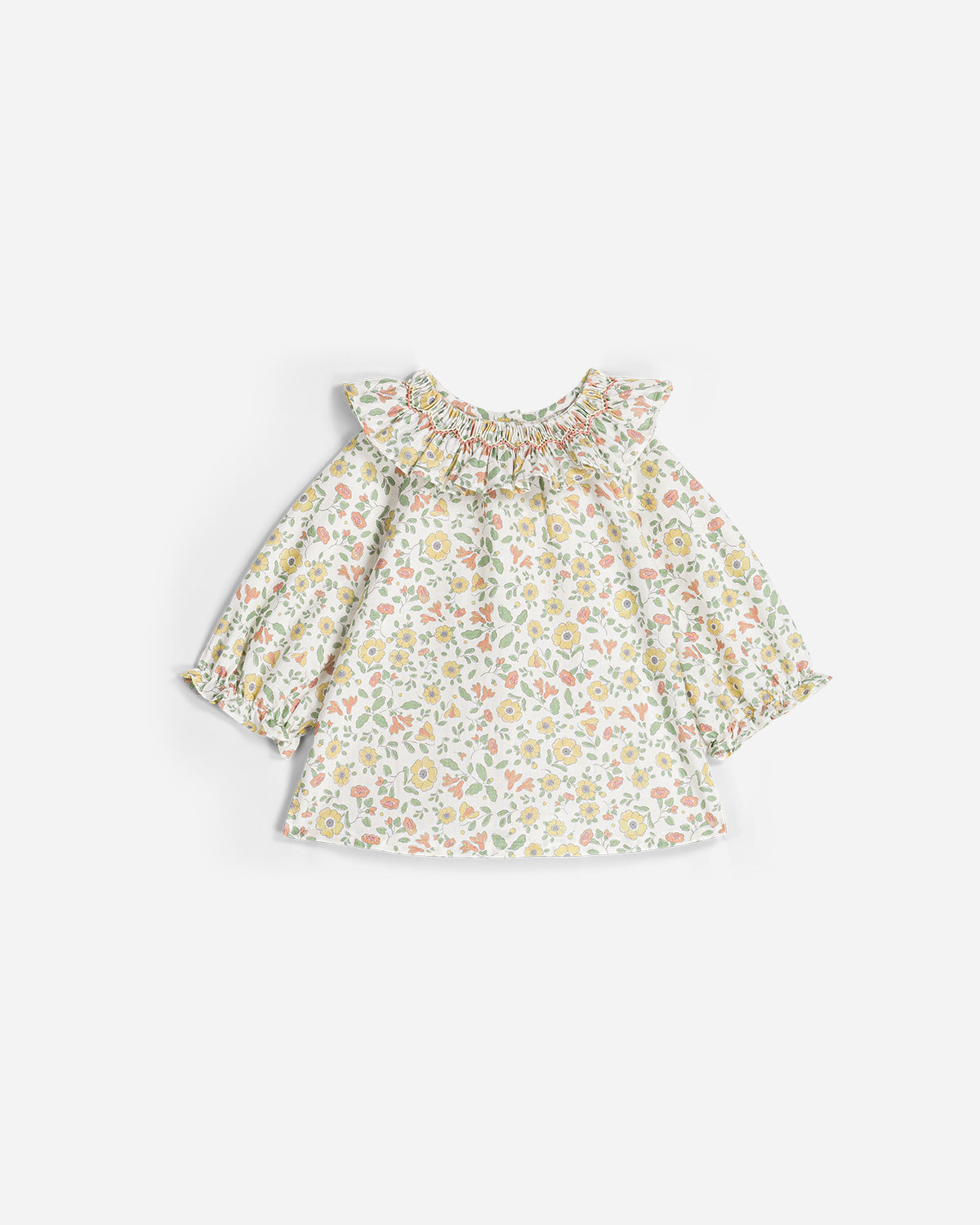La blouse Pia habille bébé de douceur et de fraîcheur avec son imprimé fleuri aux teintes jaune, rouge, et vert. Un petit vent de printemps souffle sur sa garde-robe !