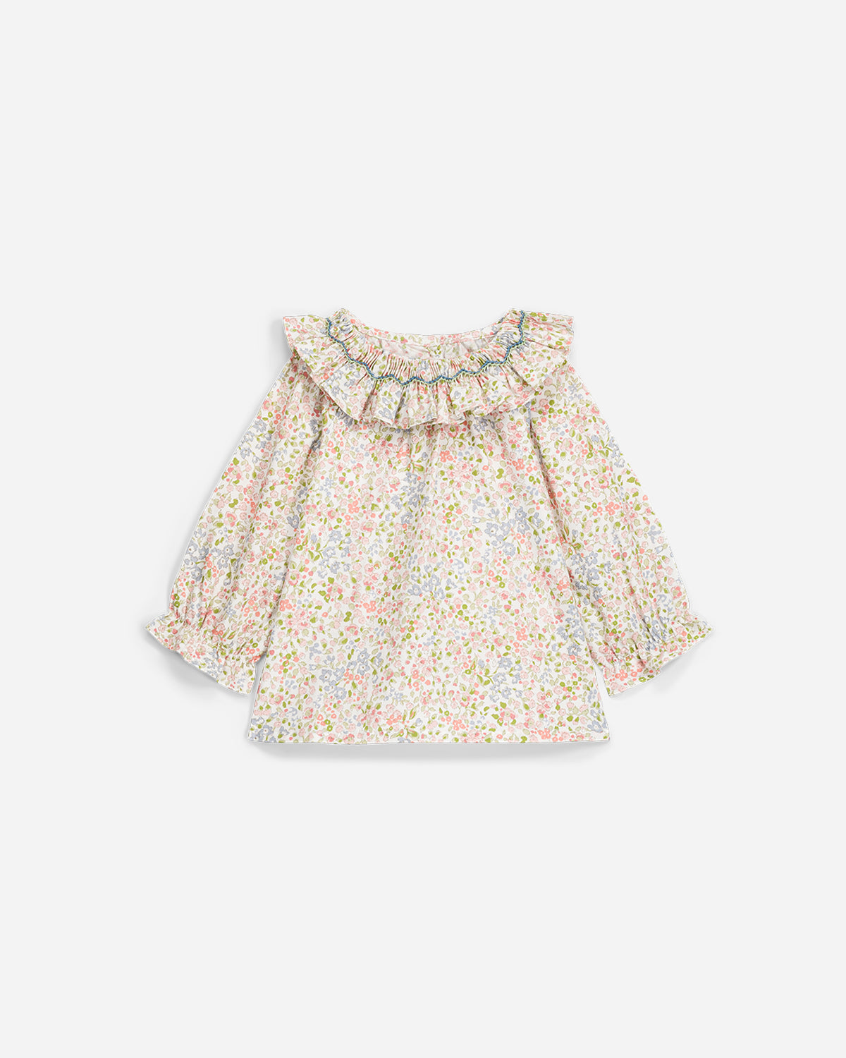 Cette blouse bébé fille Pia charme par son imprimé fleuri délicat aux tons pastel, parfait pour une allure douce et raffinée. Son large col volanté, subtilement souligné par une finition contrastée, apporte une touche élégante et poétique à la tenue.