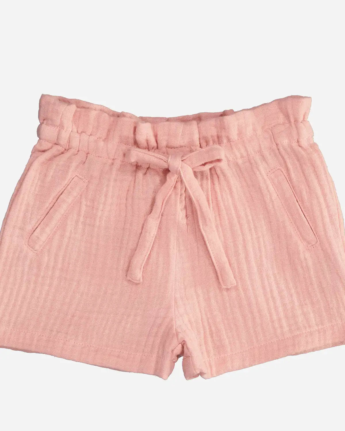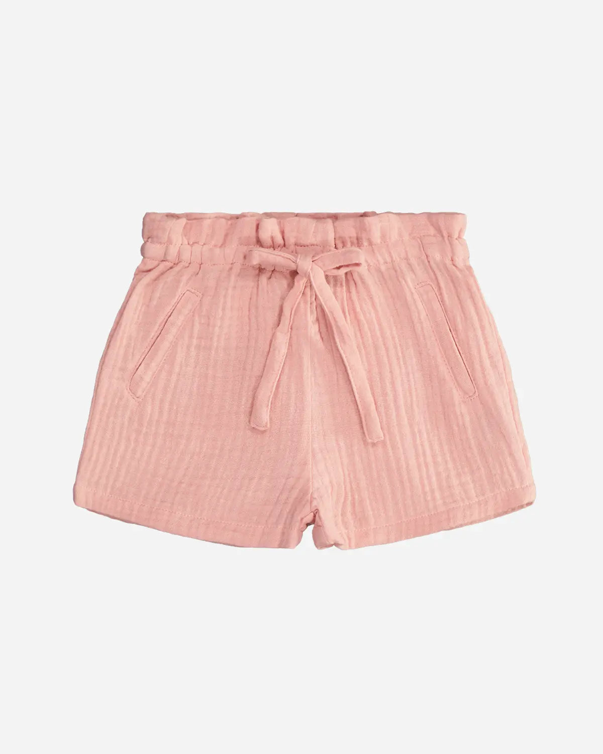 En gaze de coton rose, le short Pénélope s'associe facilement aux autres pièces du vestiaire de bébé. Il est agrémenté de poches avant et arrière.