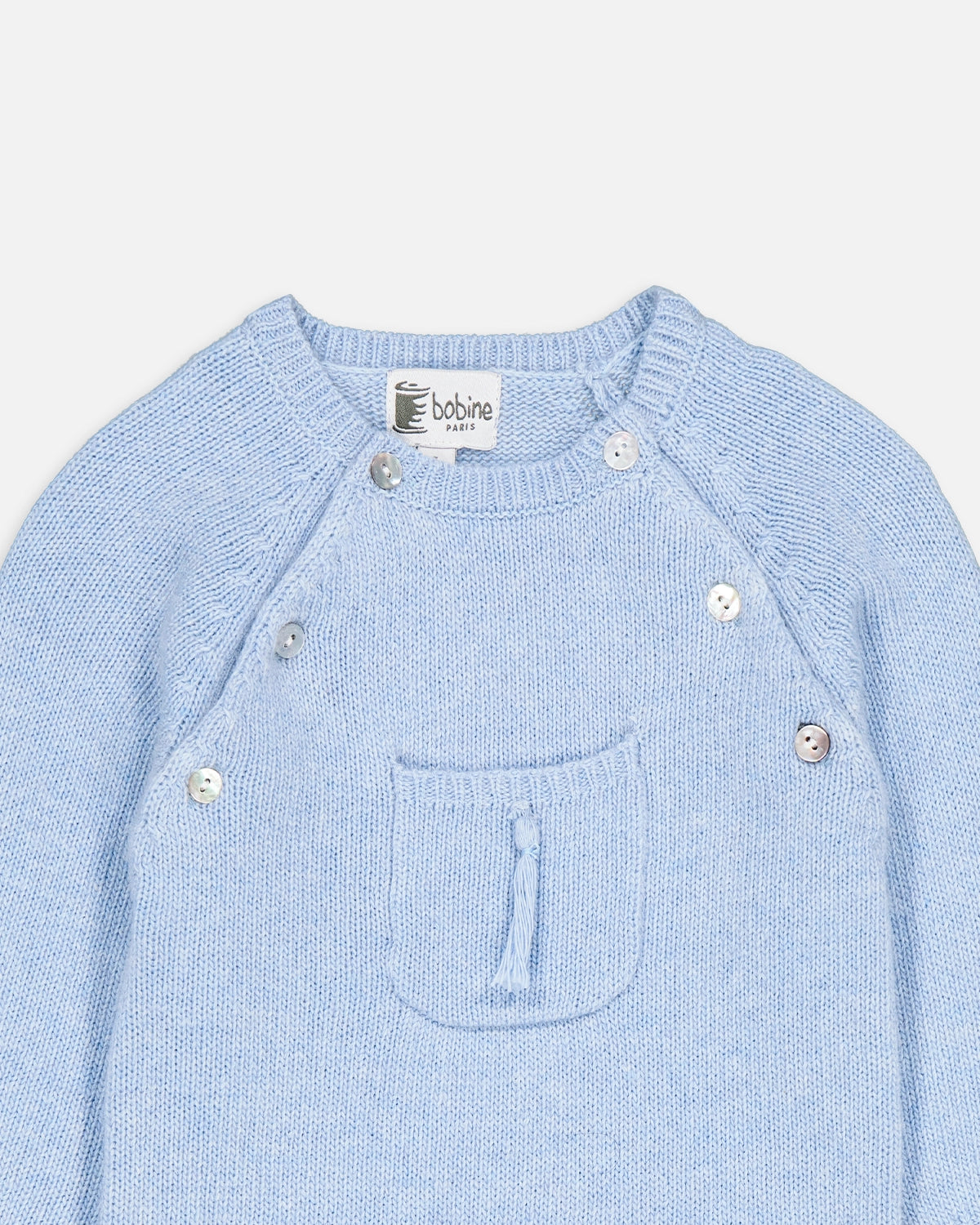 La combinaison bébé laine et cachemire bleu ciel, un emblématique bobine, est l'indispensable de l'hiver pour votre petit garçon, alliant élégance et confort. La douceur incomparable du cachemire se marie à la chaleur naturelle de la laine, créant un cocon de confort pour votre petit trésor. La teinte bleu ciel apportera une touche de délicatesse aux tenues de votre tout-petit. Pratique avec ses boutons à l'entre-jambe et offrant une liberté de mouvement optimale, cette pièce incarne le mariage parfait entre qualité et style.
