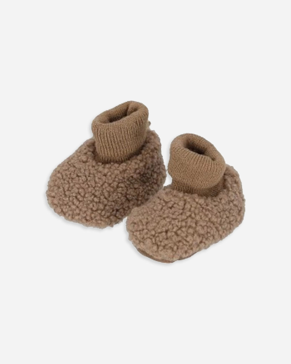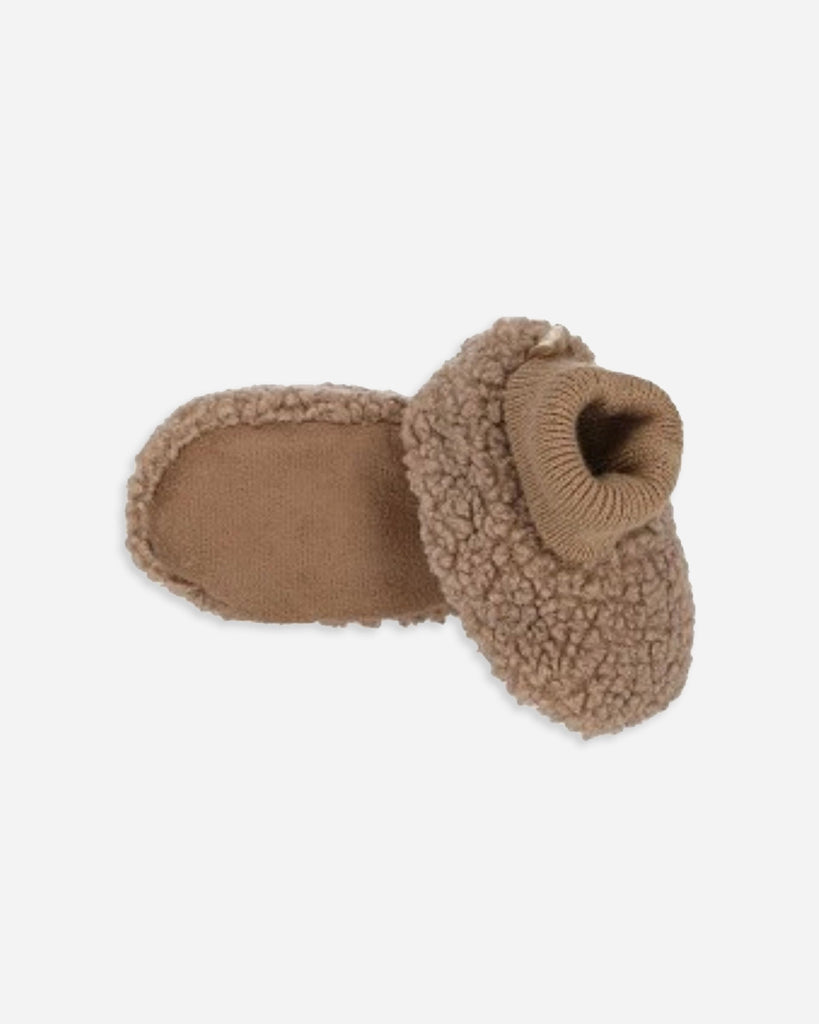 Ces chaussons bébé en bouclette beige sont un cocon de douceur pour les petits pieds de bébé. Leur forme montante enveloppe délicatement la cheville, offrant chaleur et maintien tout en laissant bébé libre de ses mouvements. Confectionnés dans une matière moelleuse et respirante, ils allient confort et praticité au quotidien. Leur teinte écrue, douce et naturelle, s'accorde facilement avec toutes les tenues, pour un look aussi tendre qu'élégant.