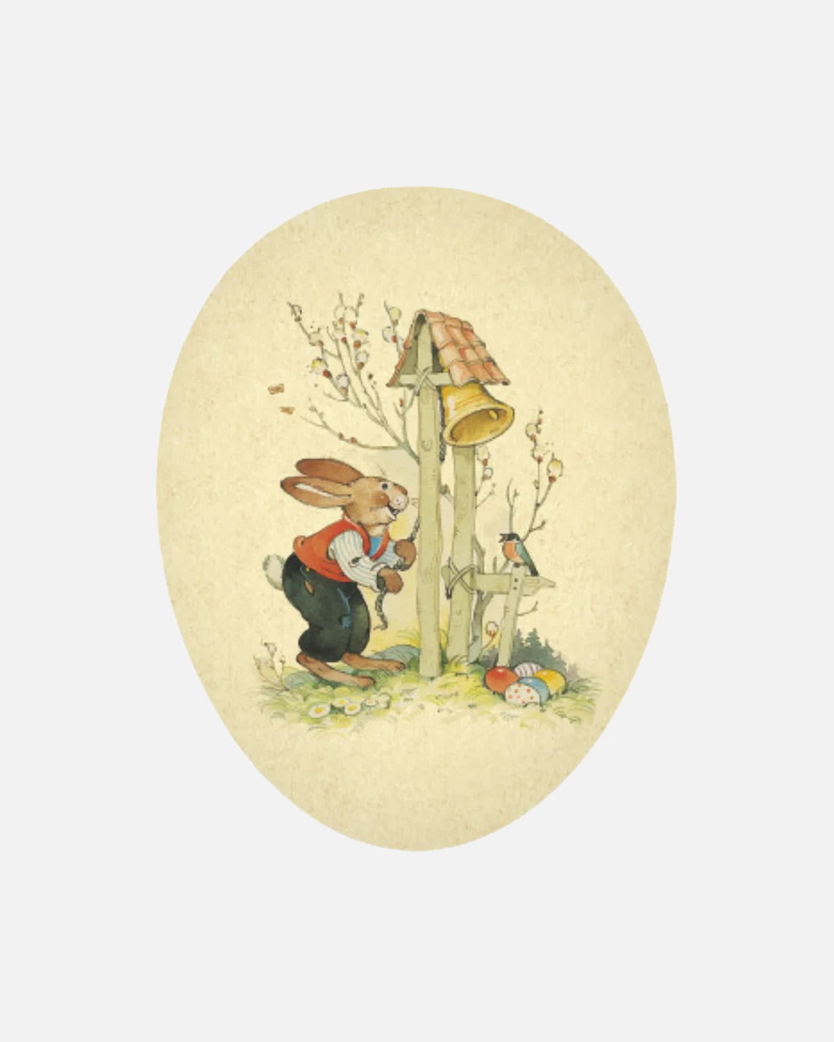 Célébrez le retour du printemps avec cette boîte à œuf traditionnelle, véritable hymne à la joie et aux traditions de Pâques. Fabriquée en carton rigide et recouverte de papier à la texture délicate, elle illustre une scène charmante : un lapin joyeux, vêtu d'un gilet rouge, faisant sonner la cloche de Pâques pour annoncer la fête.