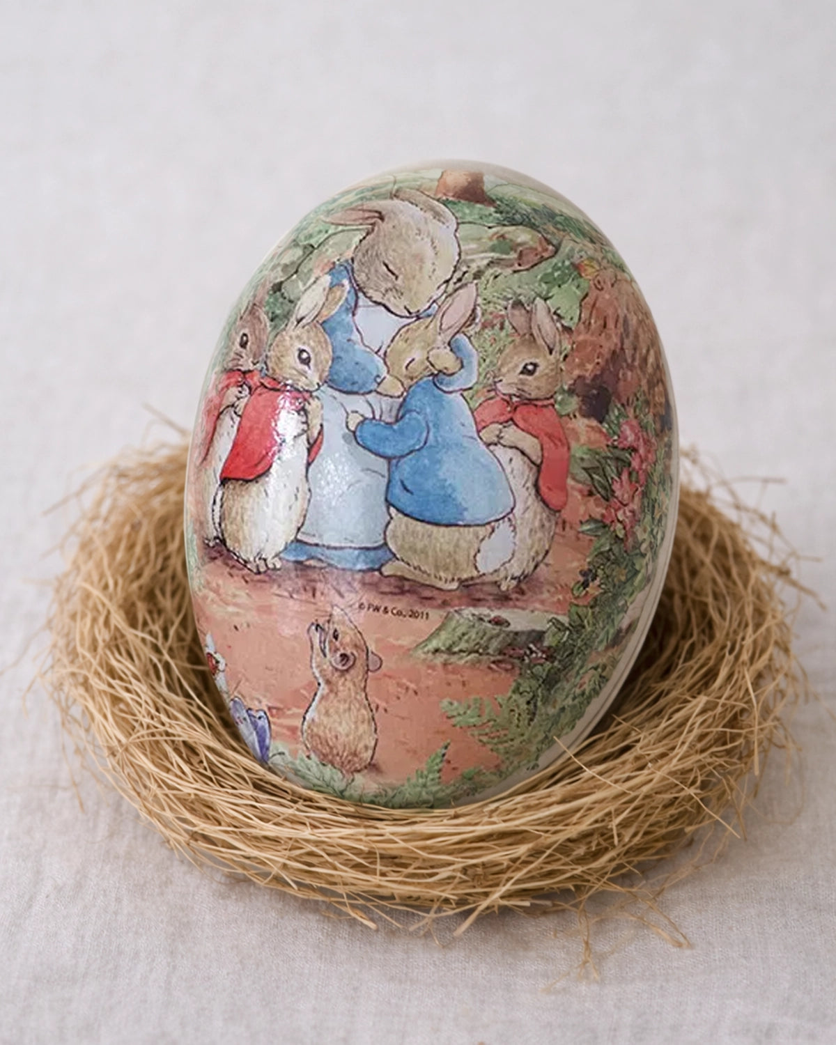 Ajoutez une touche de poésie et de nostalgie à vos fêtes de Pâques avec cette magnifique boîte en papier et carton en forme d’œuf. Ornée d'une illustration vintage inspirée de l'univers intemporel de Pierre Lapin, elle représente une scène tendre de maman lapin entourée de ses petits dans un jardin fleuri.