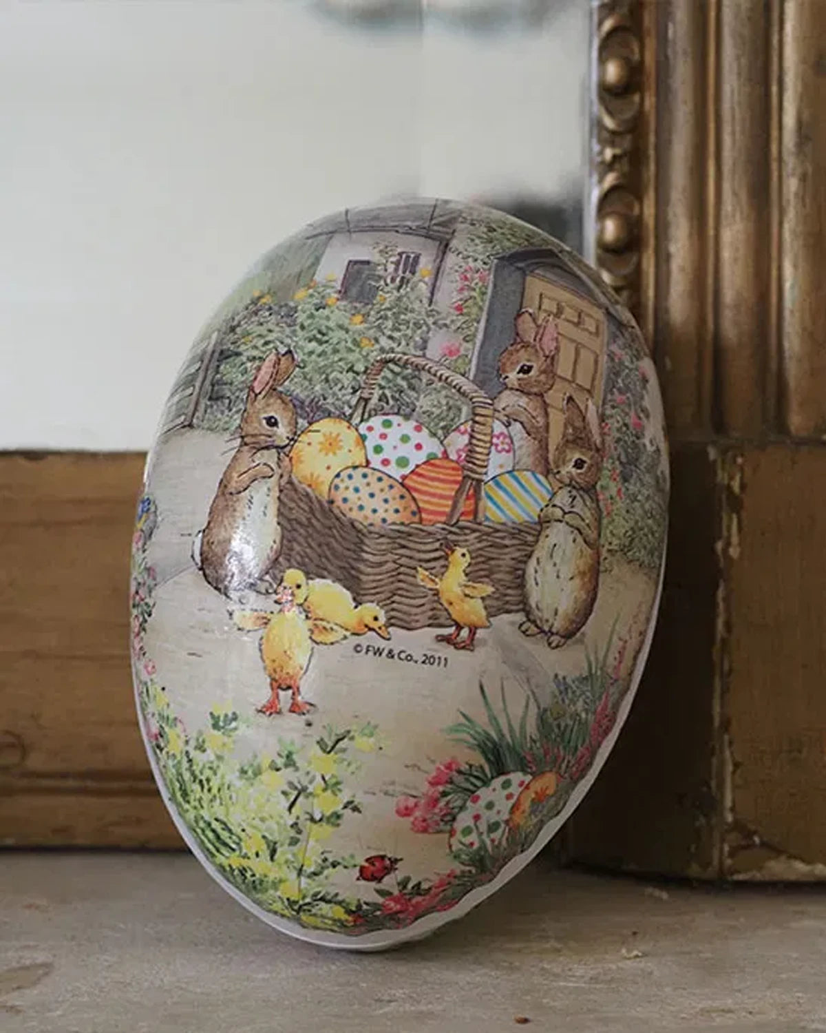 Plongez au cœur des préparatifs du printemps avec cette boîte en papier et carton. Cette variante de notre série vintage met en scène une illustration bucolique : des lapins affairés autour d'un grand panier d'œufs colorés, accompagnés de petits poussins curieux. Un dessin qui capture toute l'effervescence et la magie de la chasse aux œufs.