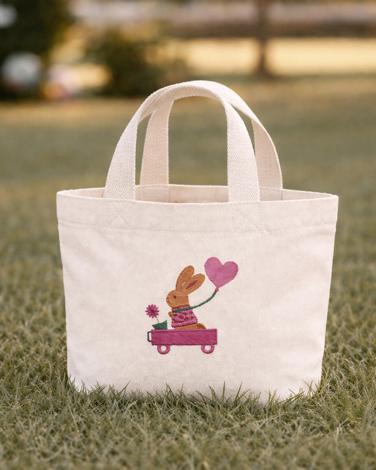 Sur une toile écrue naturelle, notre petit lapin voyageur s'affiche dans une carriole d'un rose framboise intense, tenant un grand ballon cœur rose et une petite fleur. Vêtu d'un pull assorti, il apporte une touche colorée et joyeuse qui ne manquera pas de faire briller les yeux des plus petits.