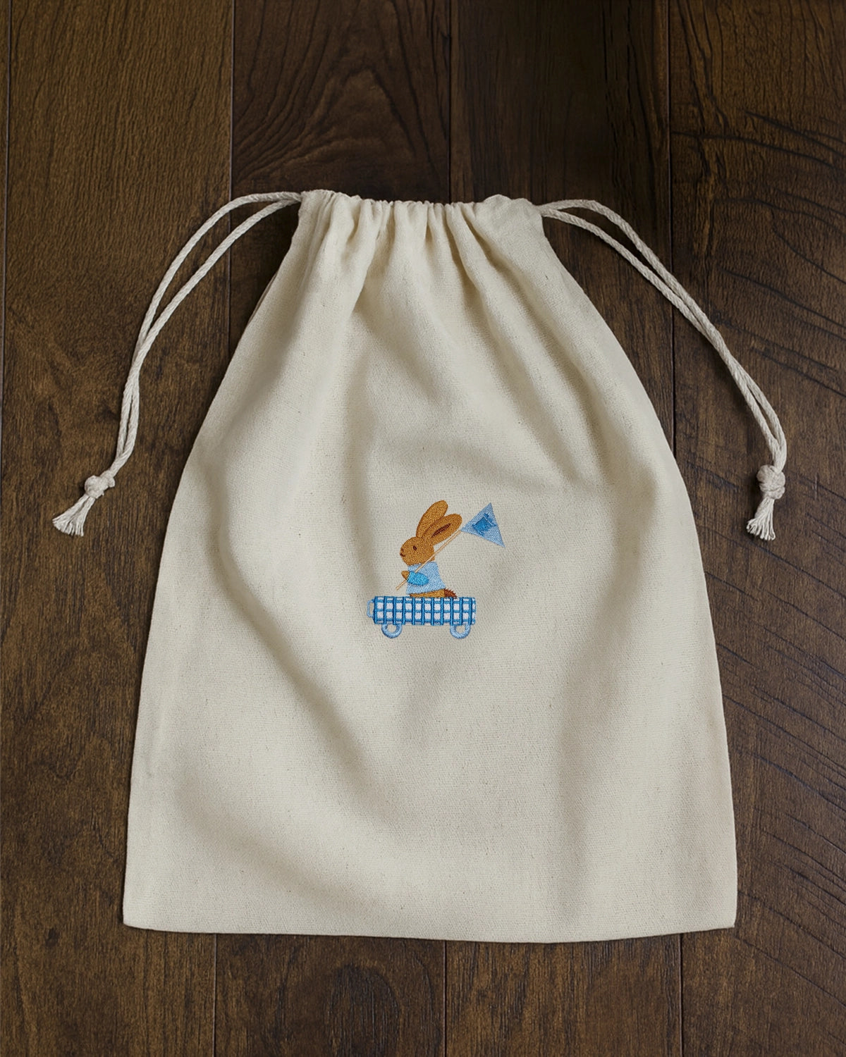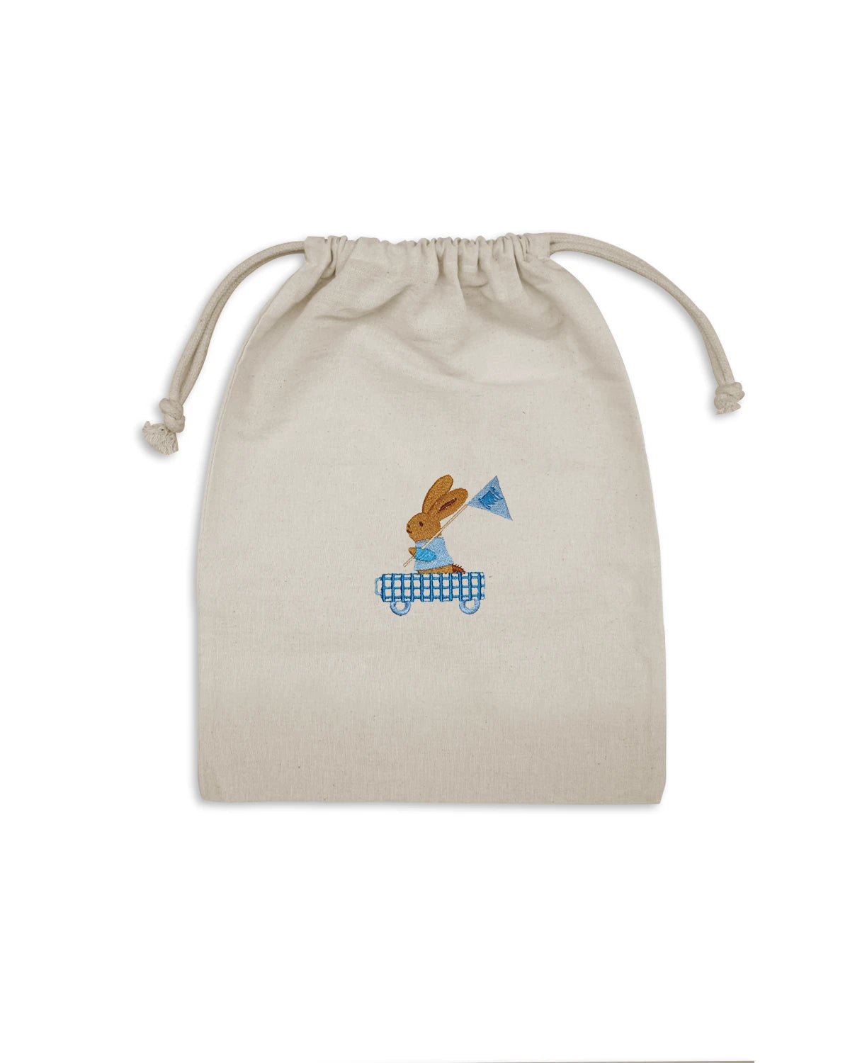 Cette élégante pochette en tissu naturel est idéale pour offrir ou ranger de petits objets avec délicatesse. Confectionnée en coton de couleur écru, elle se ferme facilement grâce à son lien coulissant, garantissant à la fois praticité et esthétique. Son design raffiné est sublimé par une broderie de lapin cariole bleu à carreaux évoquant un univers doux, poétique et intemporel.