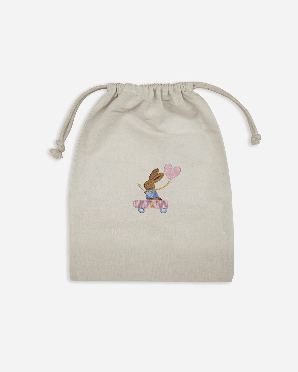 Cette élégante pochette en tissu naturel est idéale pour offrir ou ranger de petits objets avec délicatesse. Confectionnée en coton de couleur écru, elle se ferme facilement grâce à son lien coulissant, garantissant à la fois praticité et esthétique. Son design raffiné est sublimé par une broderie de lapin cariole rose cœur évoquant un univers doux, poétique et intemporel.