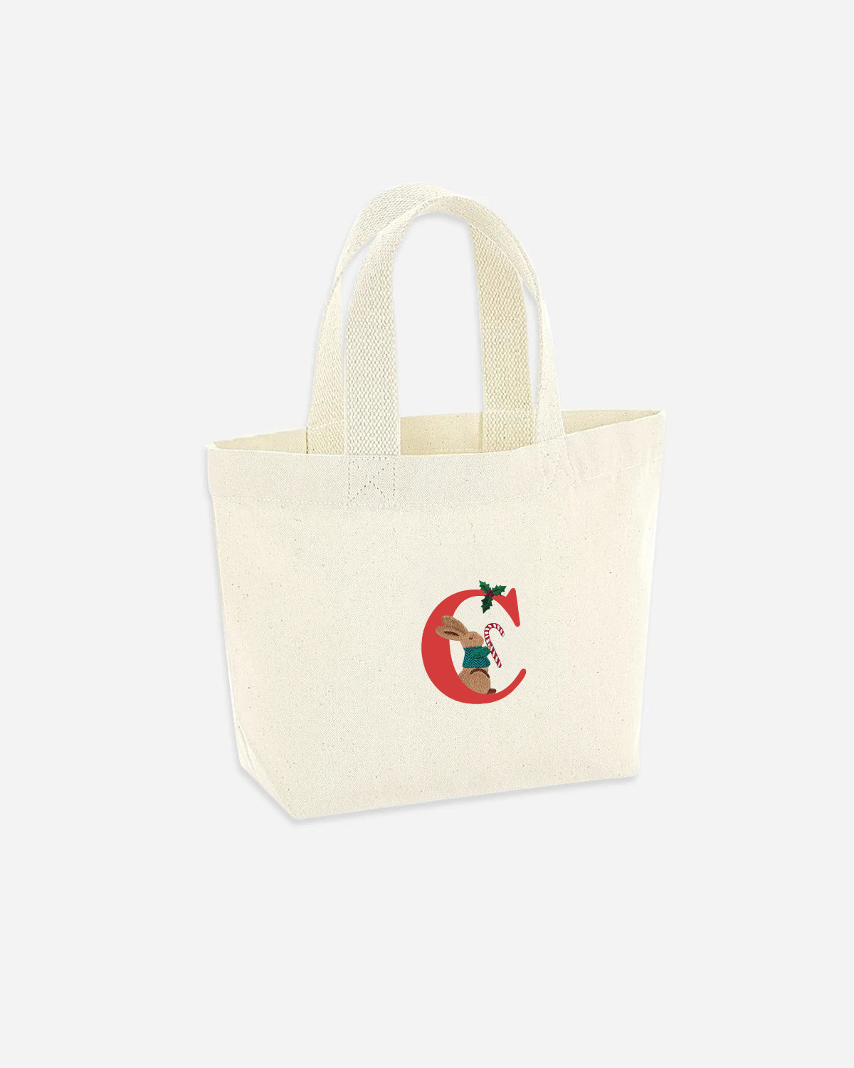Mini tote bag brodé Lapin Noël avec lettre personnalisable