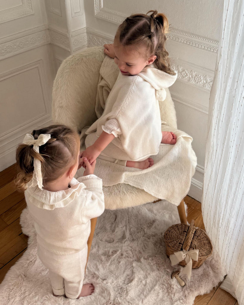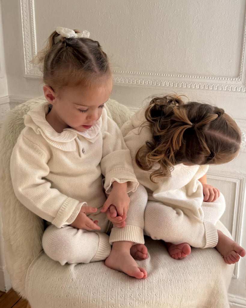 Craquez pour cet adorable ensemble Romane ! Retrouvez notre pull cache-cœur écru assorti à son pantalon laine et cachemire . Un look doux et élégant, parfait pour l'automne/hiver de bébé !