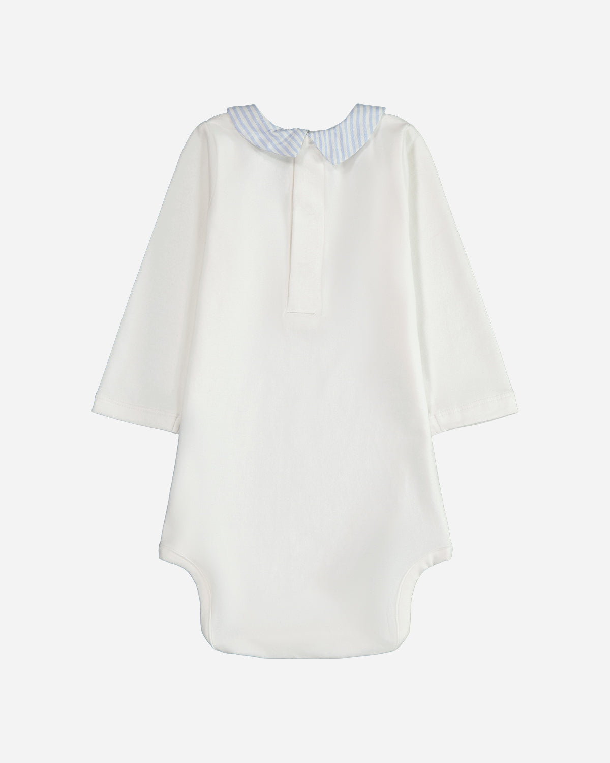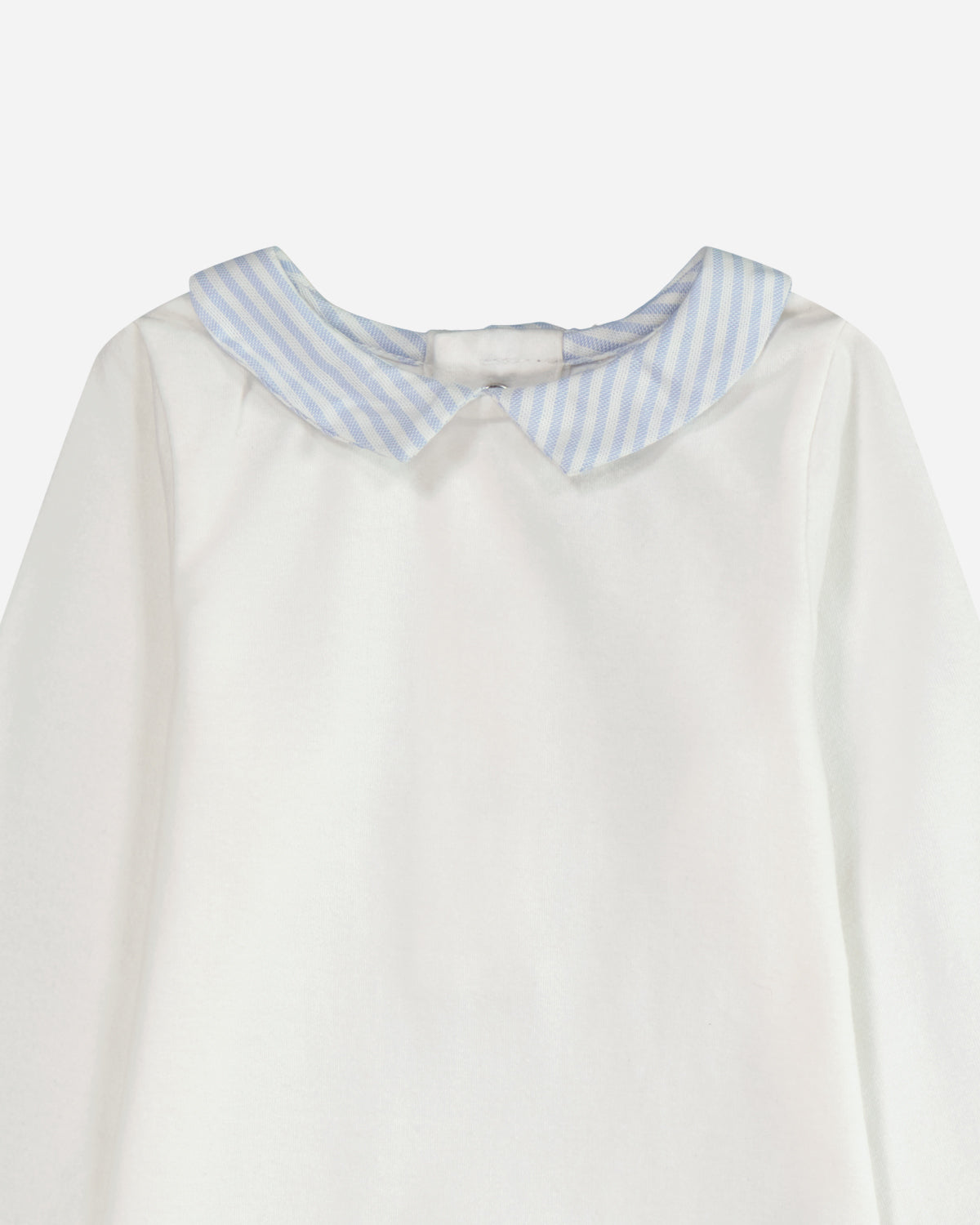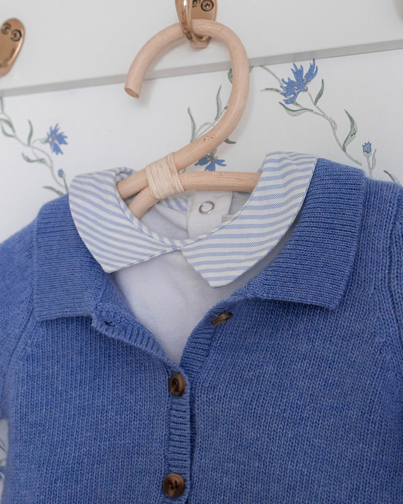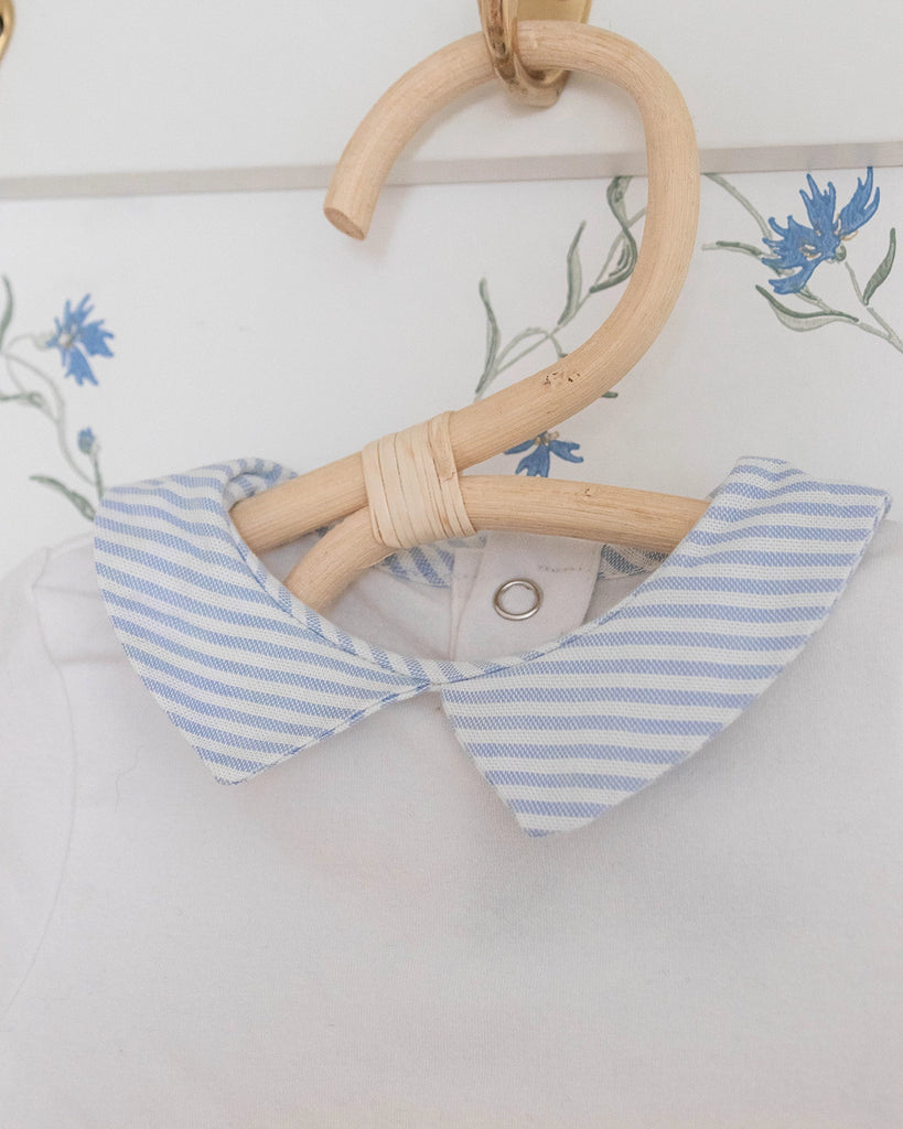 Le col pointu à rayures ciel apporte à cette tenue une élégance intemporelle. Les manches longues garantissent que bébé reste bien au chaud. Parfait pour les journées fraîches, ce vêtement associe harmonieusement style classique et confort optimal pour votre petit trésor.