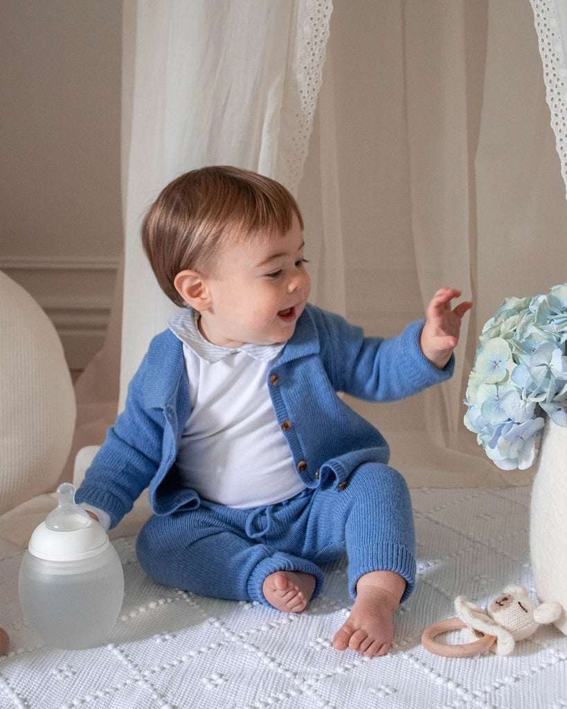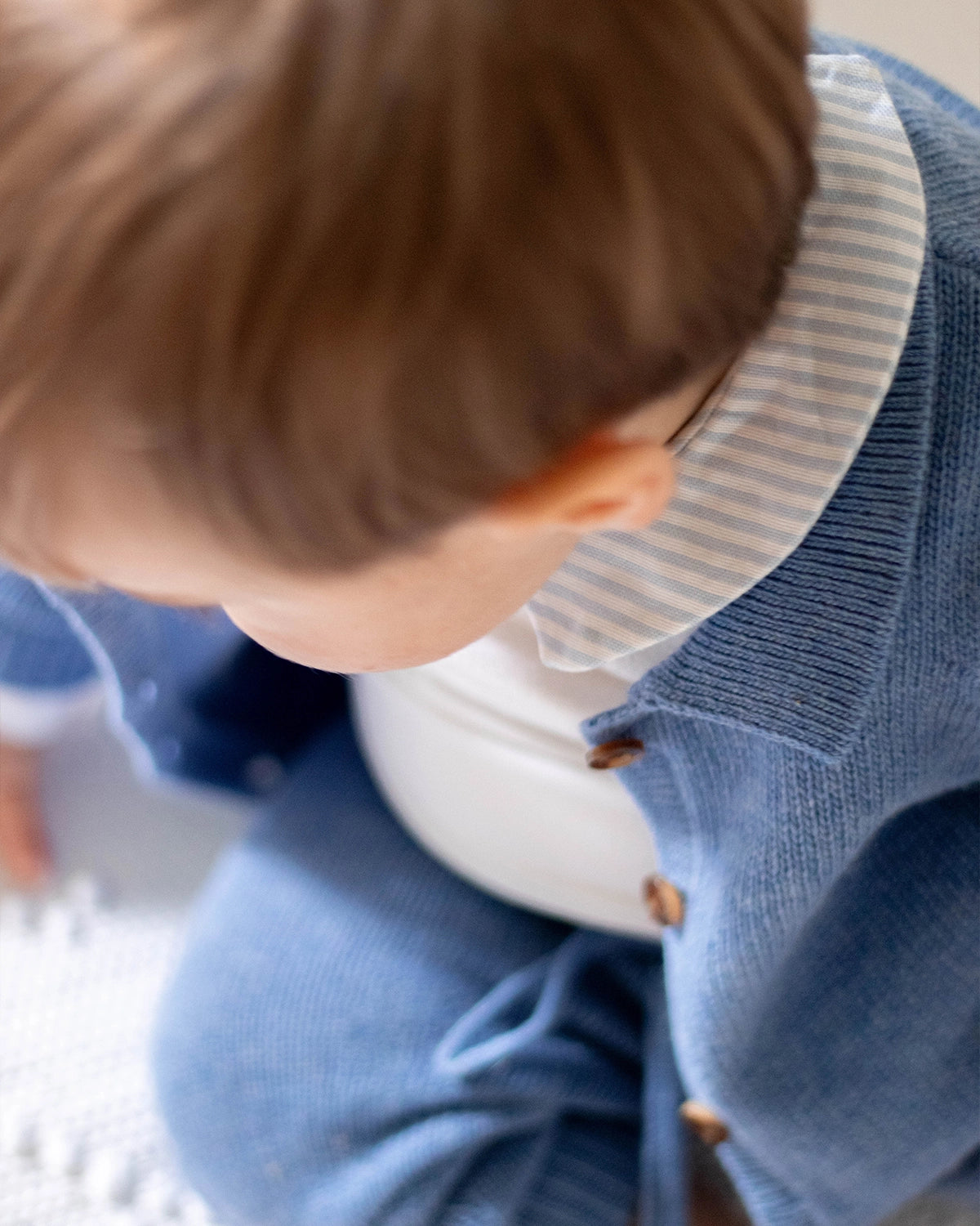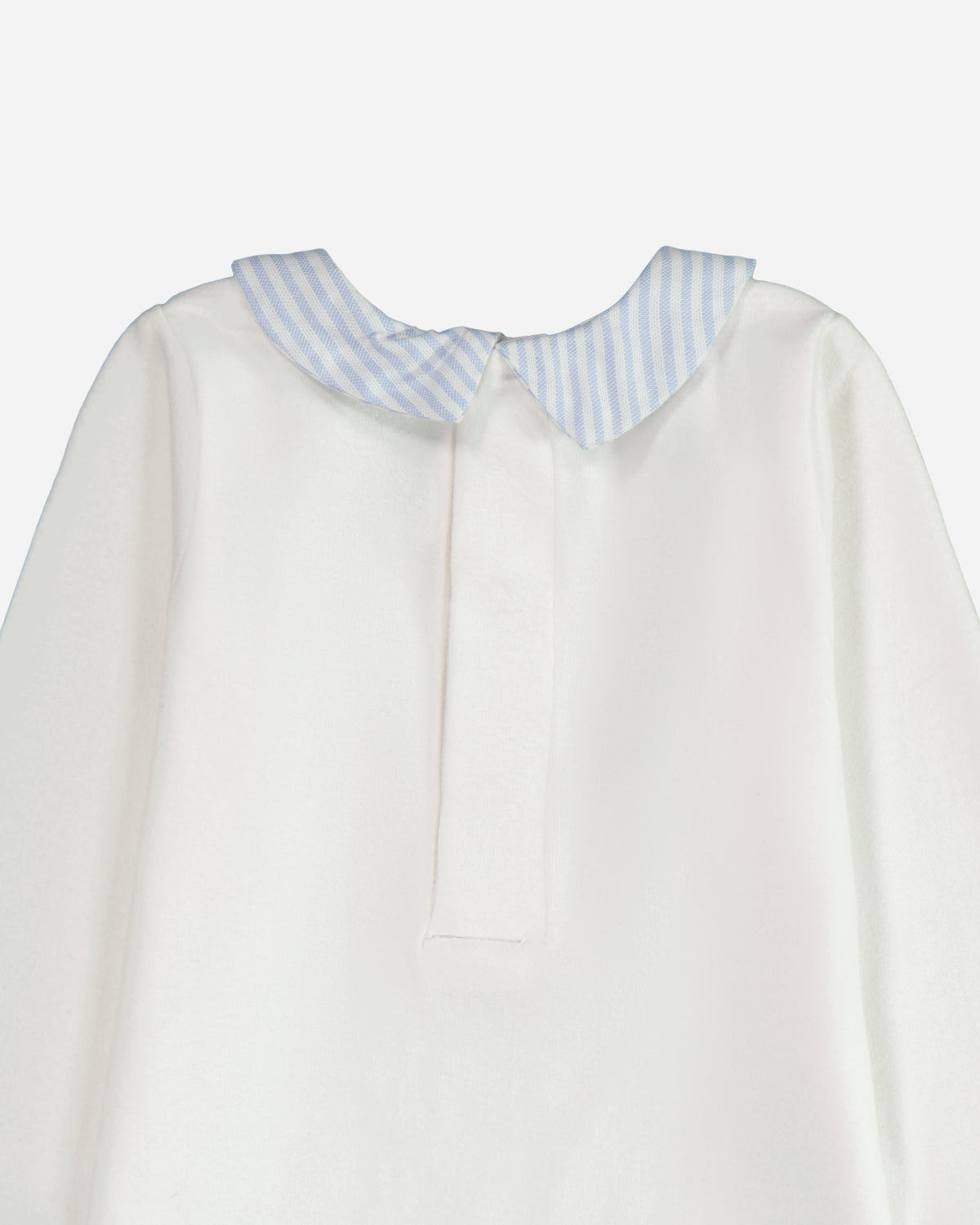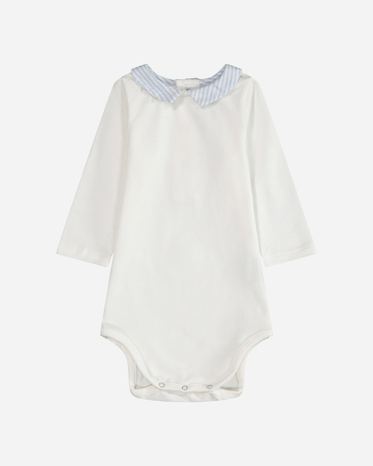 Le col pointu à rayures ciel apporte à cette tenue une élégance intemporelle. Les manches longues garantissent que bébé reste bien au chaud. Parfait pour les journées fraîches, ce vêtement associe harmonieusement style classique et confort optimal pour votre petit trésor.