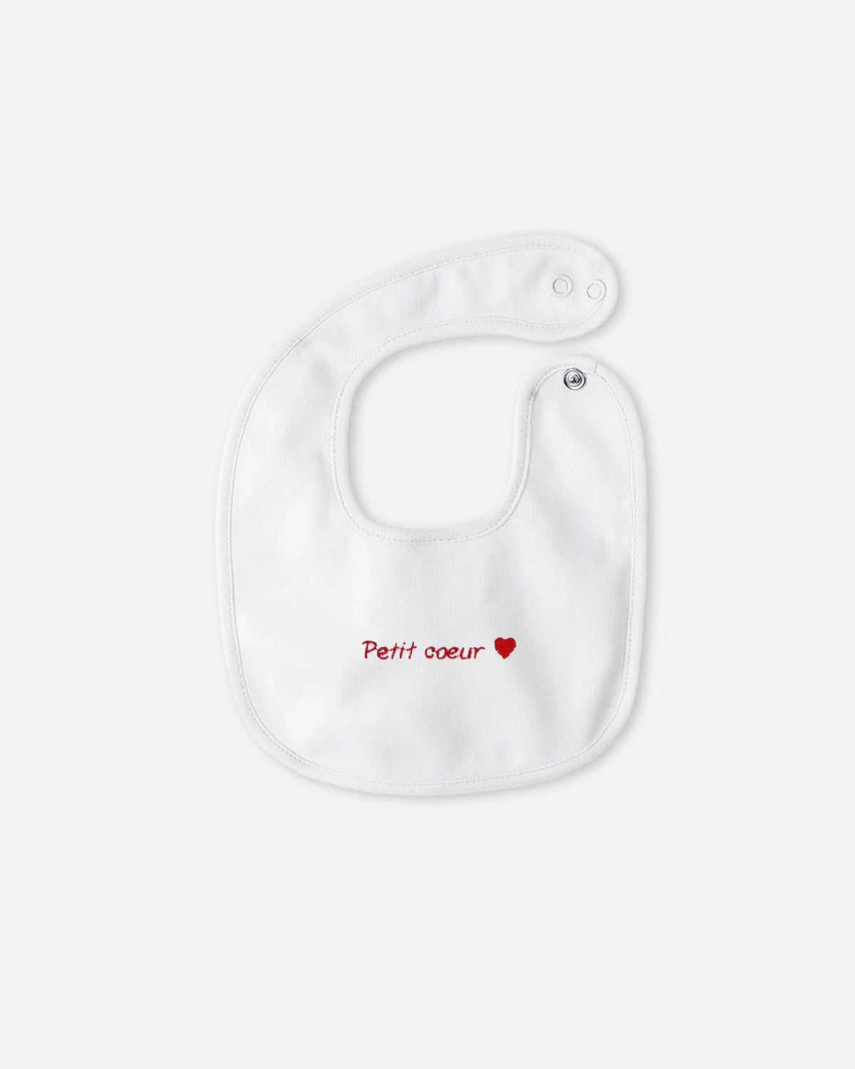 Craquez pour cet adorable bavoir de naissance en coton blanc, brodé "Petit cœur" . Un cadeau unique et très utile !