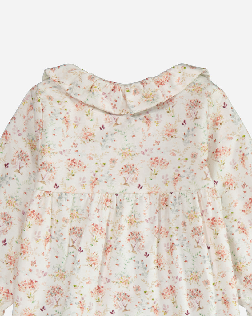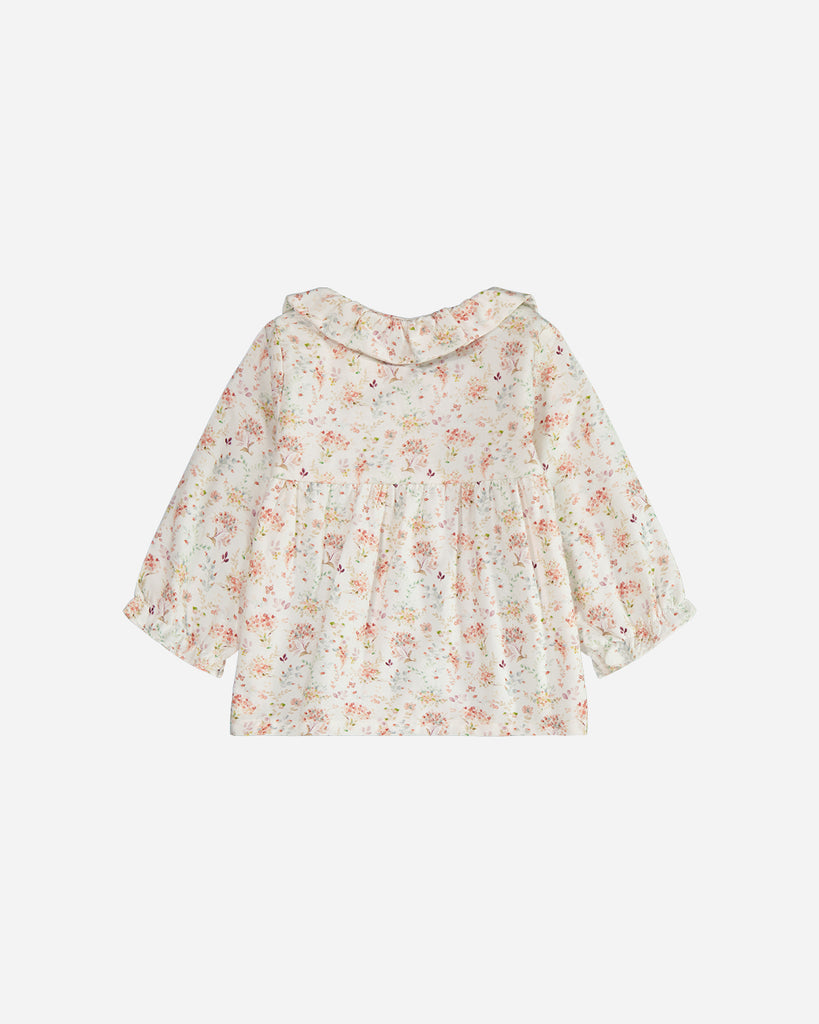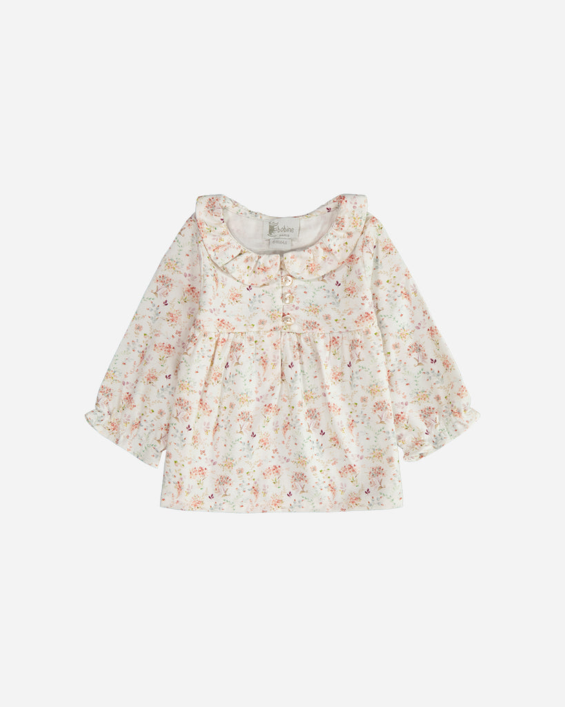 La blouse bebe à manches longues Ava pour fille, confectionnée en coton Oeko-Tex, présente un volume ravissant. Son tissu blanc est agrémenté de motifs floraux adorables. Les détails de son col claudine et de ses bas de manches élastiqués ajoutent une touche charmante.