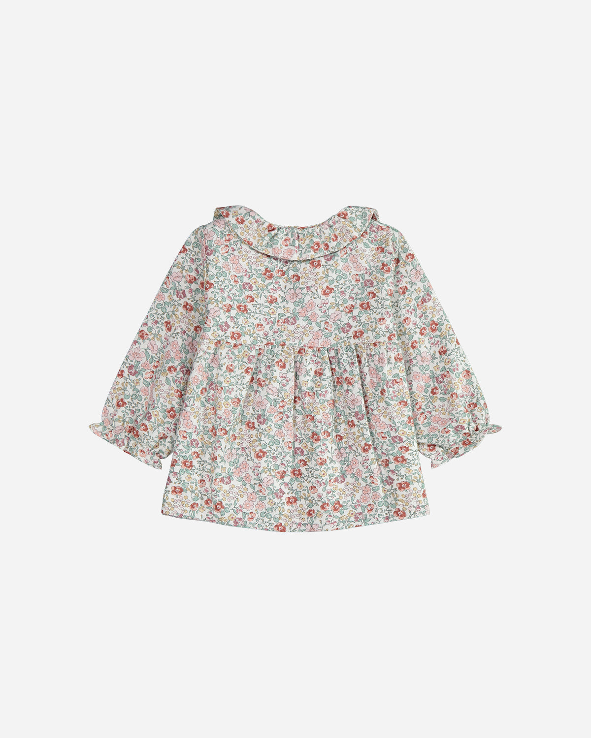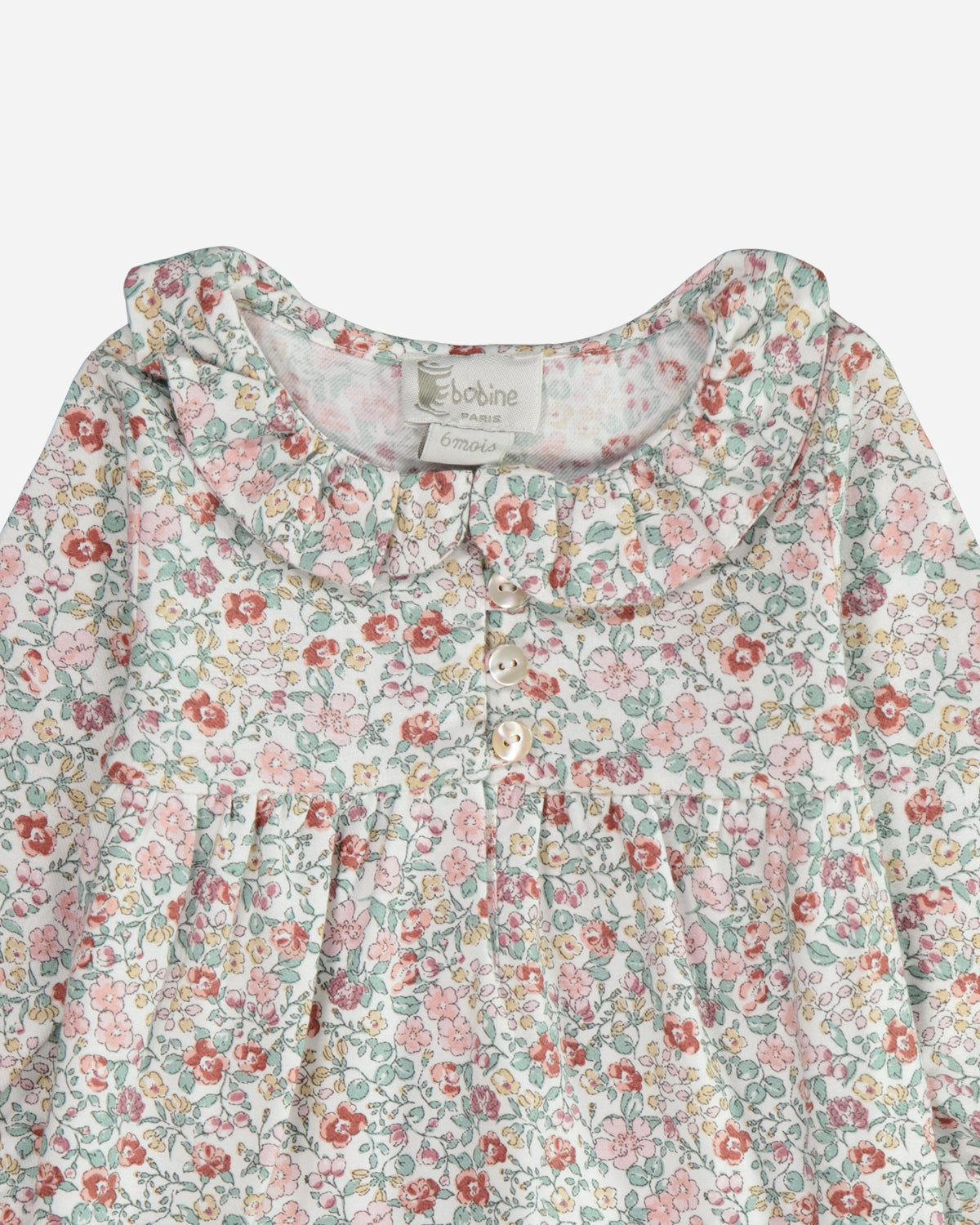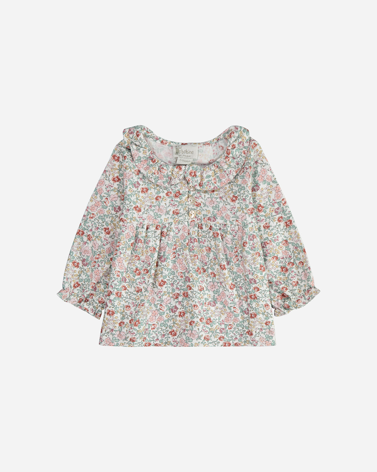 La blouse bebe manches longues Ava pour fille, fabriquée en coton Oeko-Tex, offre un charmant volume. Son tissu au motif floral émeraude et rose est élégant. On apprécie les détails de son col claudine et de ses bas de manches élastiqués.