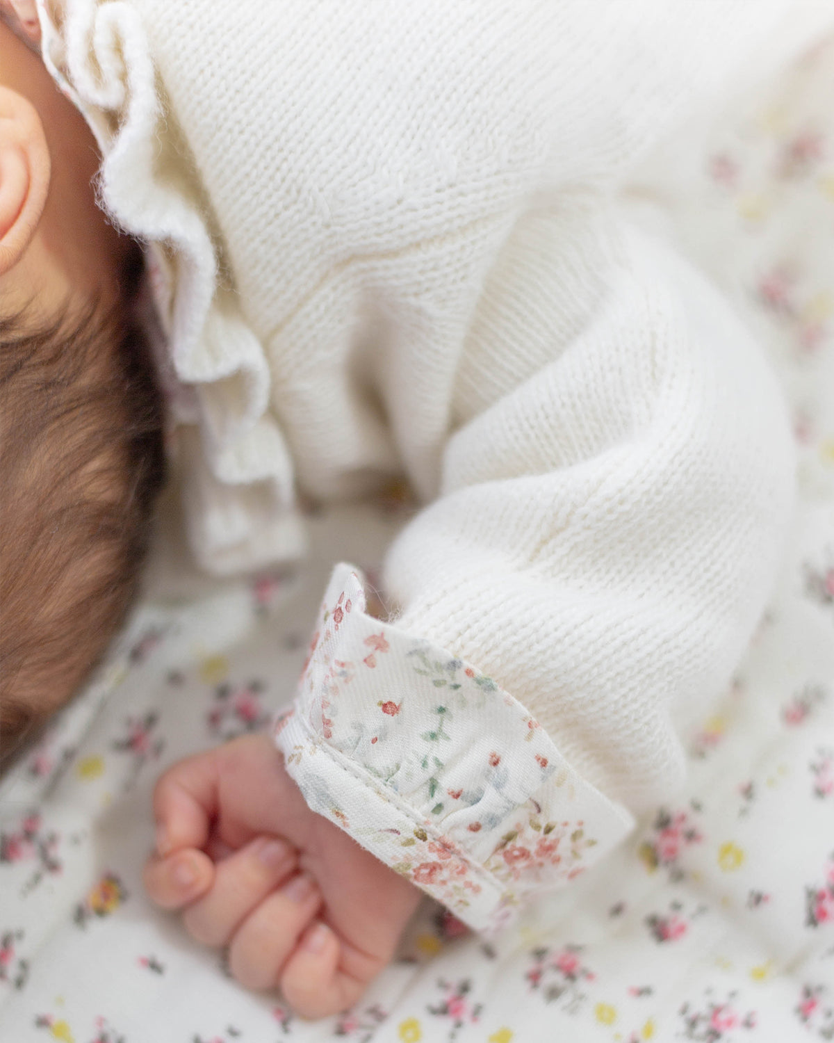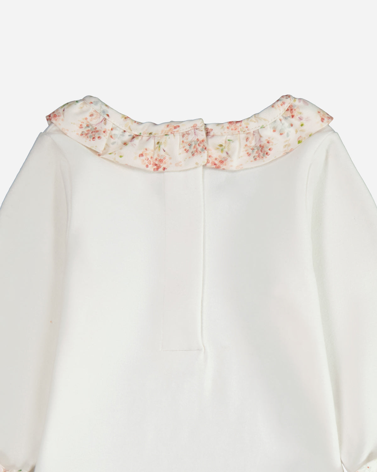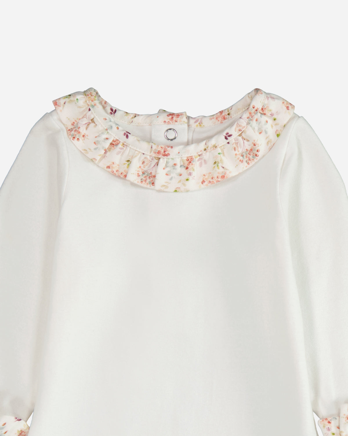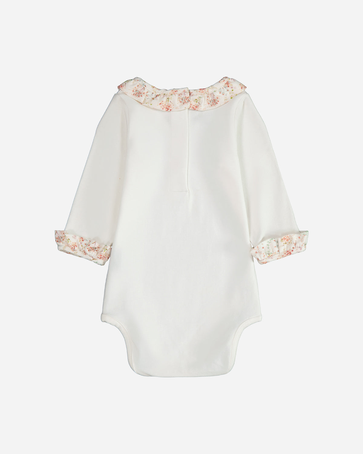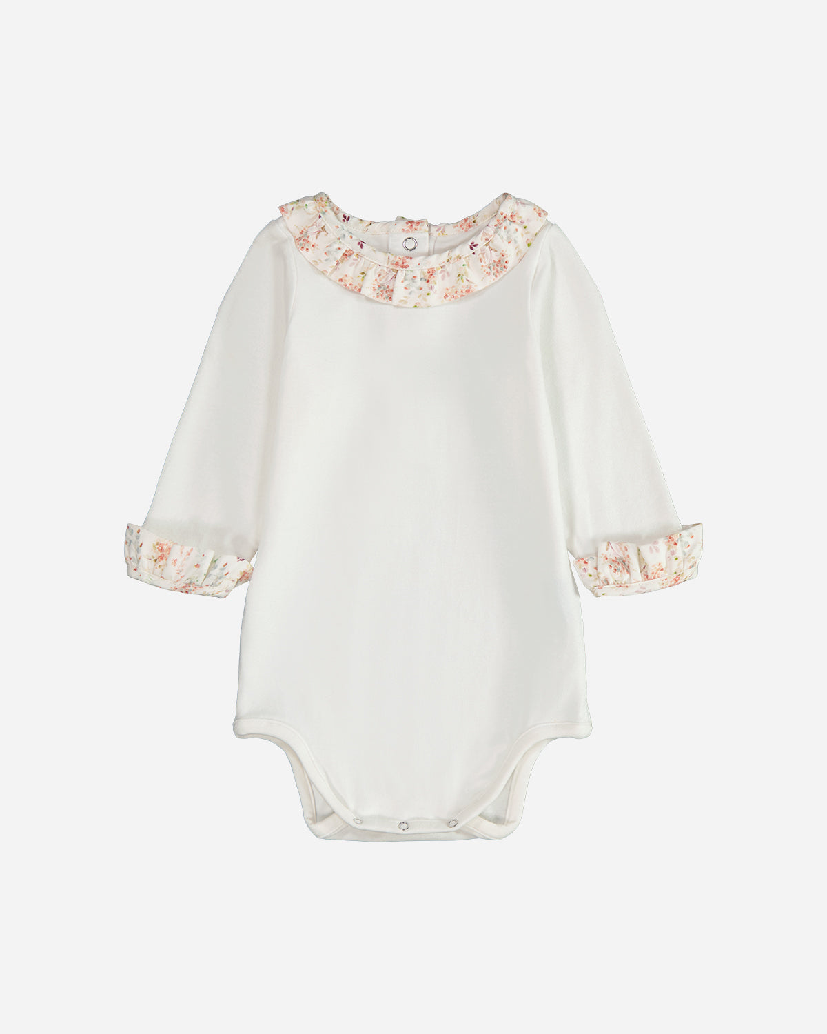 Laissez-vous séduire par notre body pour bébé. Ce charmant vêtement ajoutera une touche d'élégance aux tenues de votre petit trésor avec son col délicatement volanté et ses manches ornées de motifs floraux rosés. Confectionné dans un tissu doux et de haute qualité, il offre un confort optimal pour la peau délicate de bébé. Les bouton-pression à l'entrejambe simplifient l'habillage, tandis que le motif floral vibrant ajoute une note de gaieté. Ce body deviendra rapidement un incontournable de sa garde-robe.