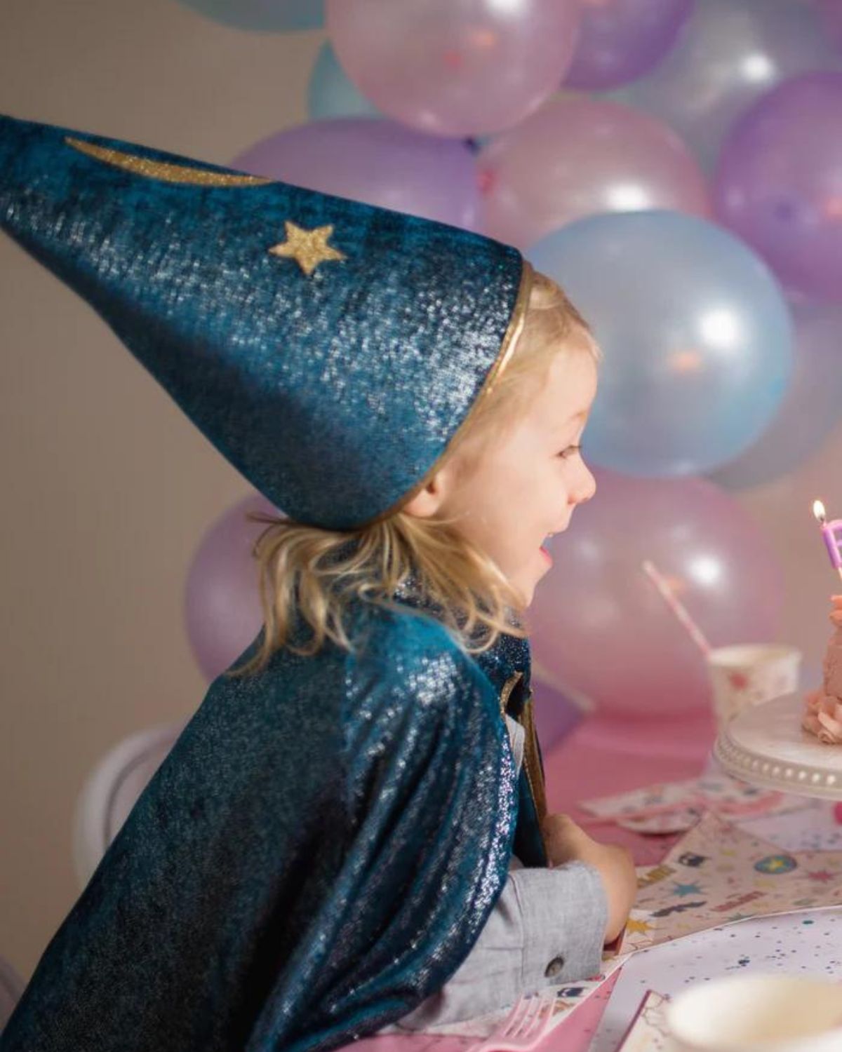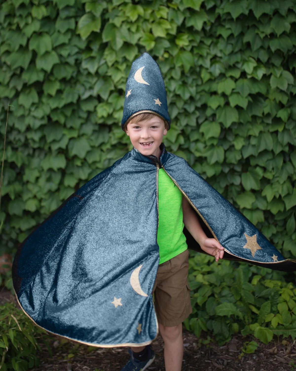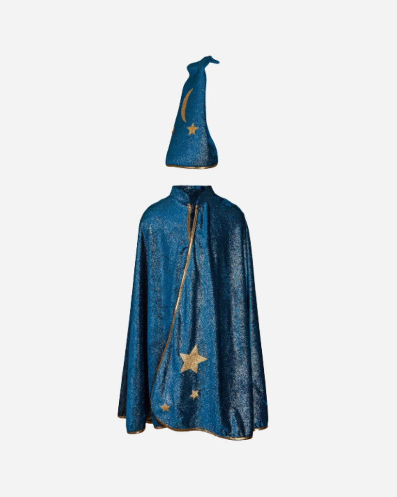 Composé de la cape bleue étoilée et du chapeau assorti, ce déguisement transformera votre enfant en un grand magicien !