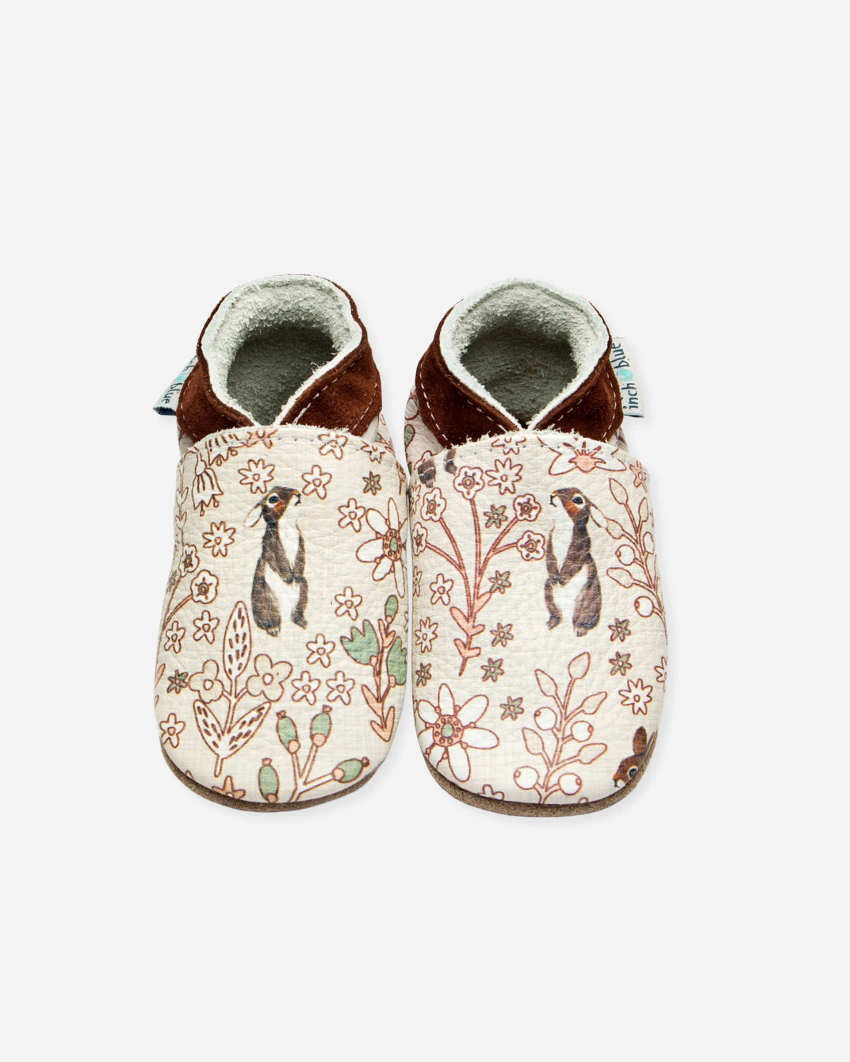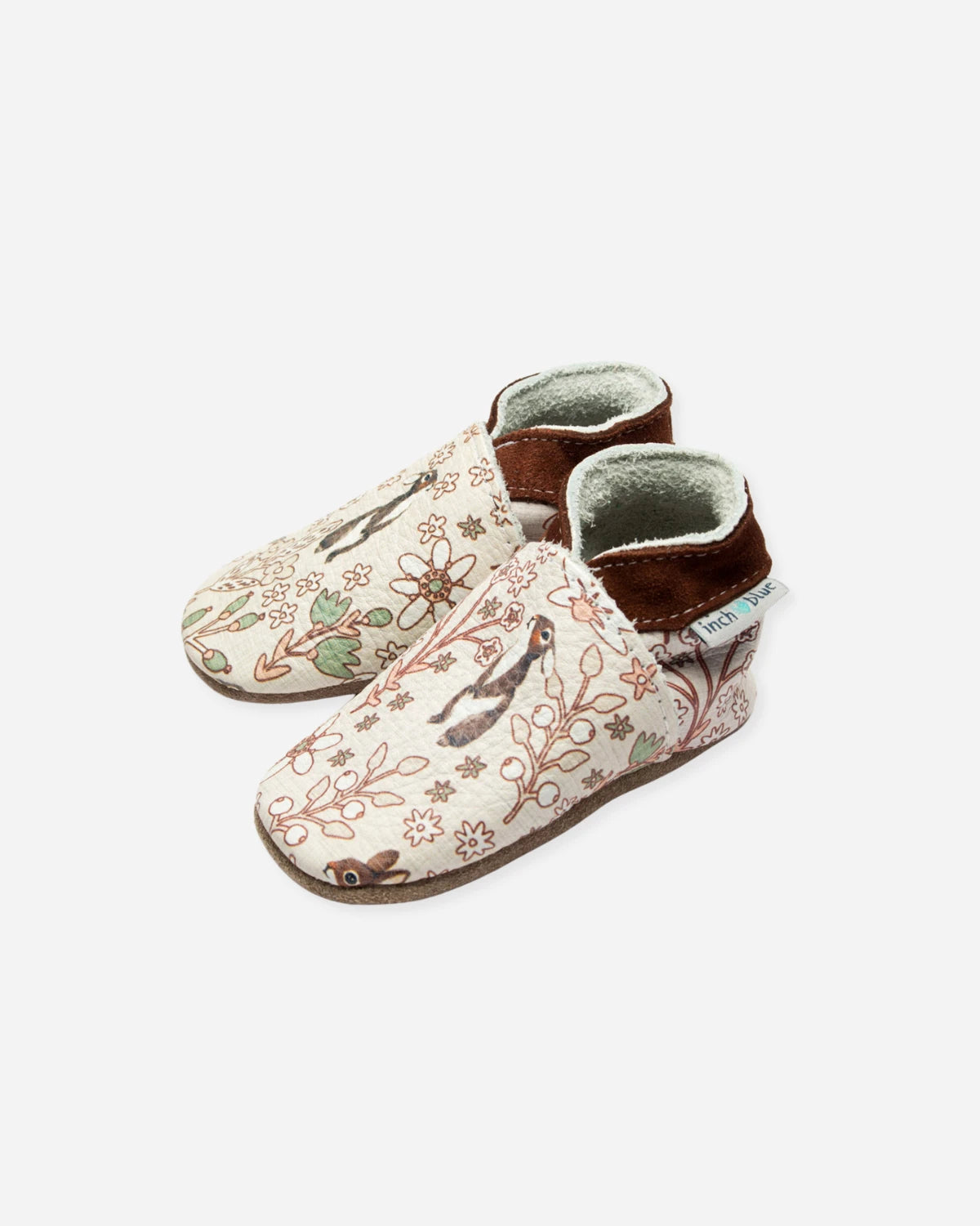Plongez dans un rêve enchanté avec ces chaussons, où un doux petit lapin se cache parmi des fleurs sauvages aux tons naturels. Conçus en cuir souple avec col en suède marron, ils offrent confort, souplesse et liberté de mouvement pour accompagner les premiers pas de bébé en toute légèreté.