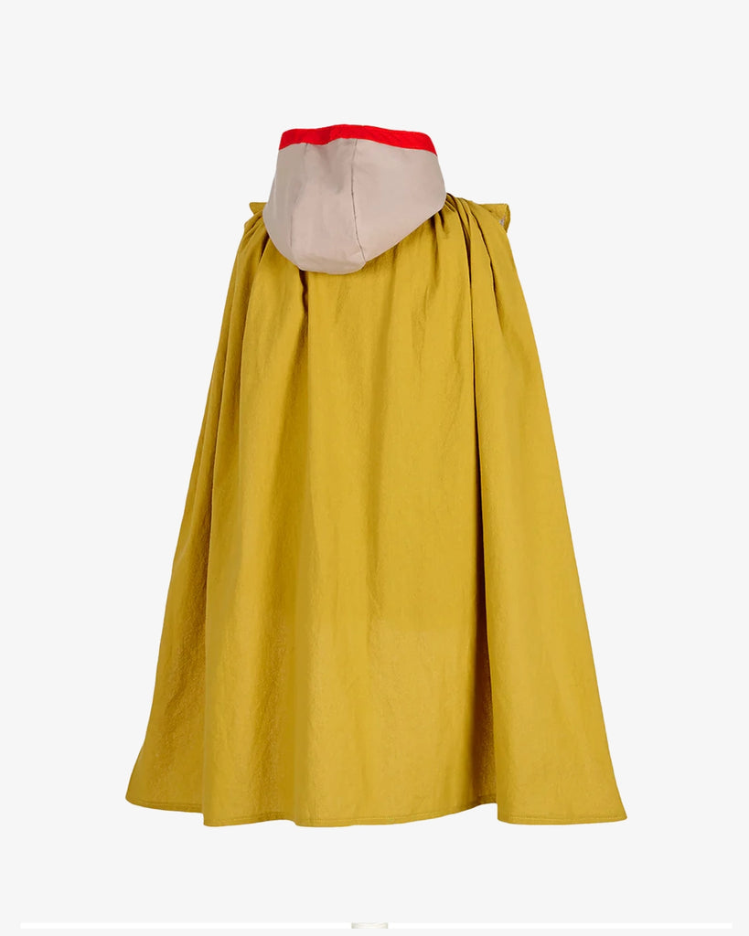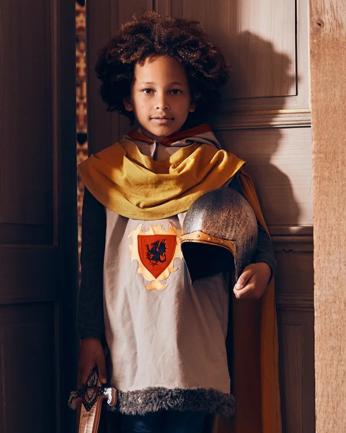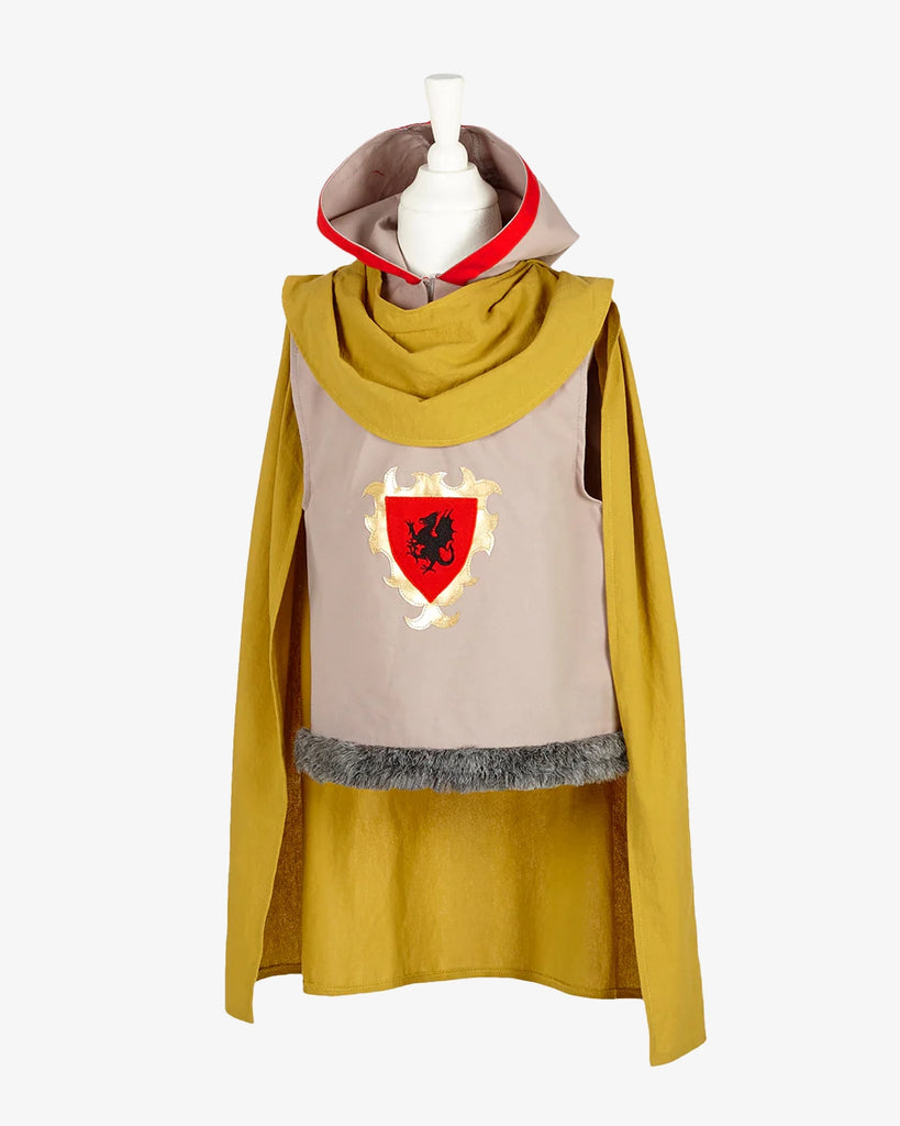 La tunique Lancelot se distingue par sa cape couleur moutarde, pourvue d'une capuche qui confère une allure mystérieuse et noble. L'écusson rouge positionné avec soin sur le devant de la tunique ajoute une note d'élégance et de fierté, complétant ainsi le look du chevalier en herbe avec raffinement et style.
