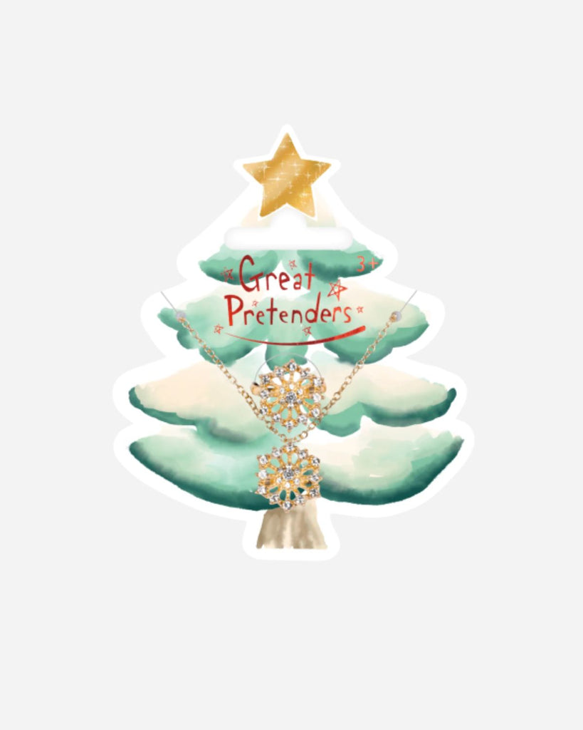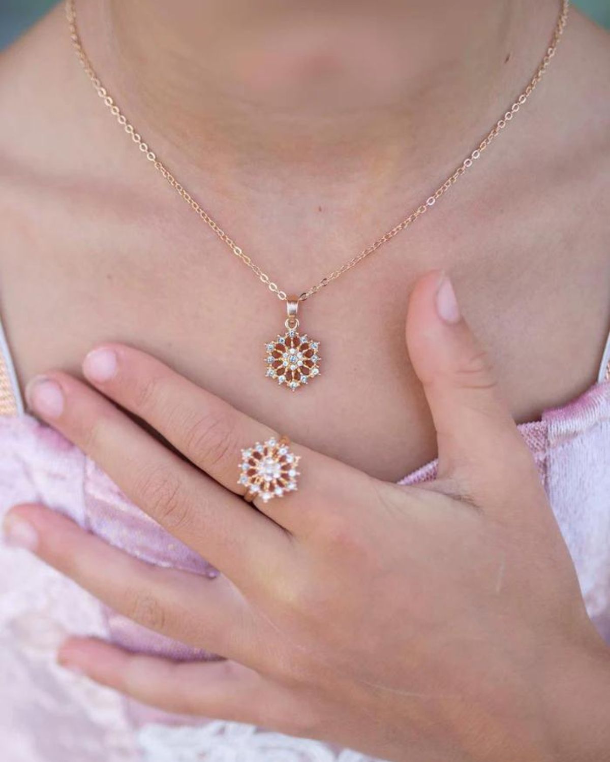 Cette somptueuse parure de bijoux, composée d'un collier orné d'un délicat flocon de diamants et d'une bague assortie, est l'accessoire parfait pour briller de mille feux pendant la période enchantée de Noël.