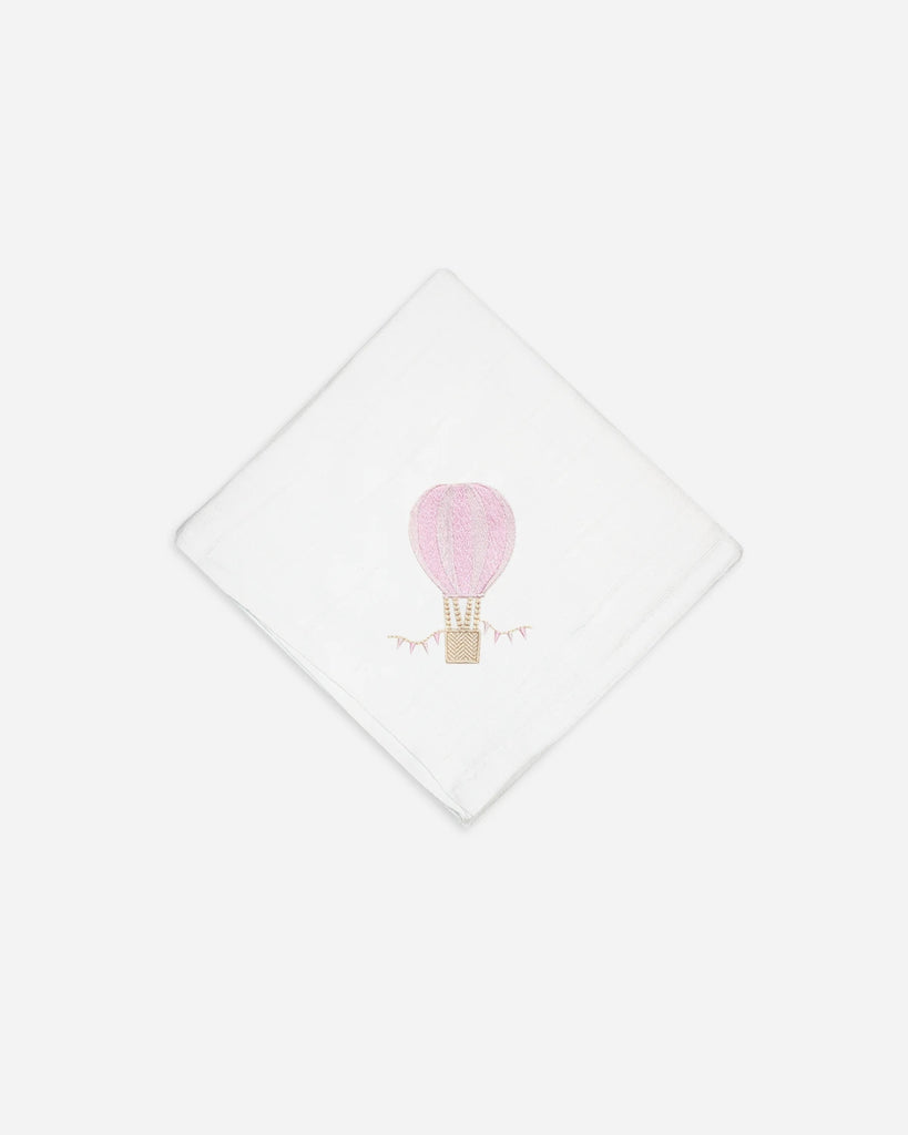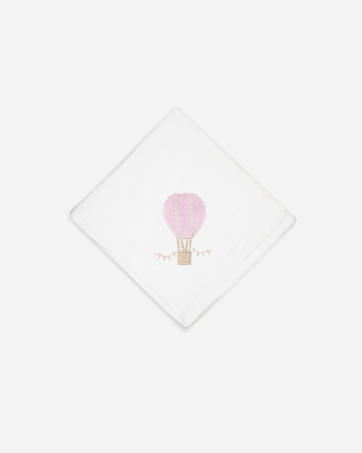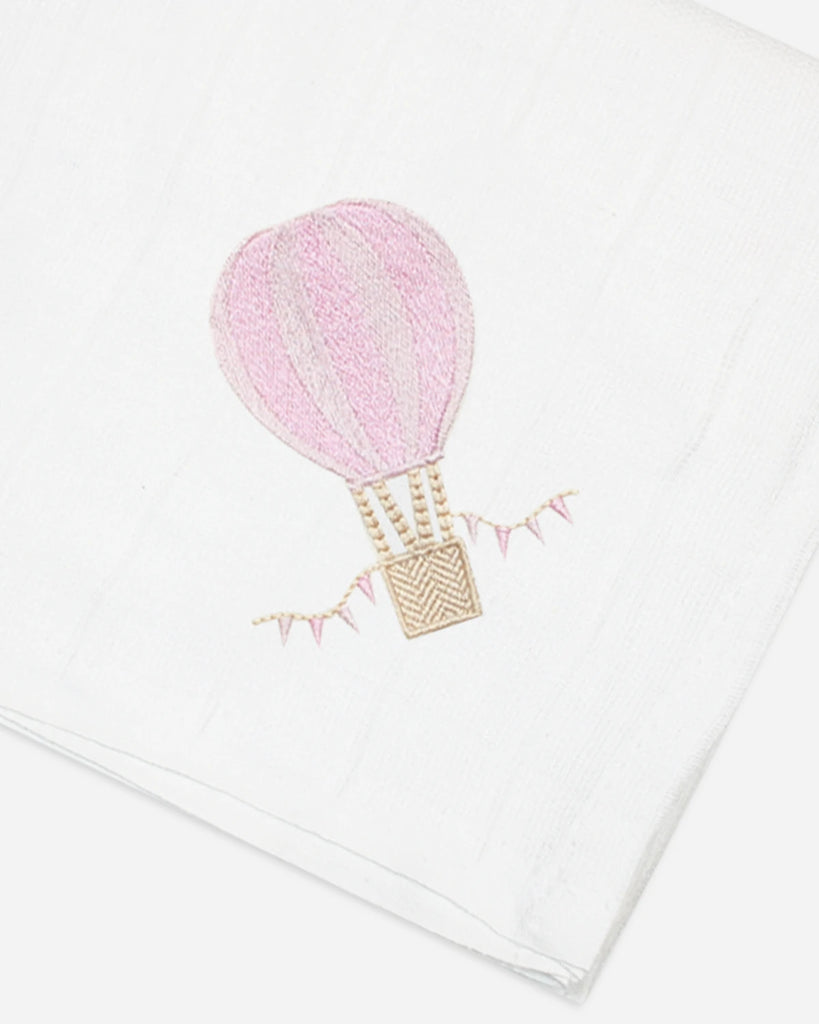 Craquez pour le lange en coton blanc tissé brodé d'une jolie montgolfière rose. Ce lange est idéal pour accompagner bébé dans ses premiers mois.