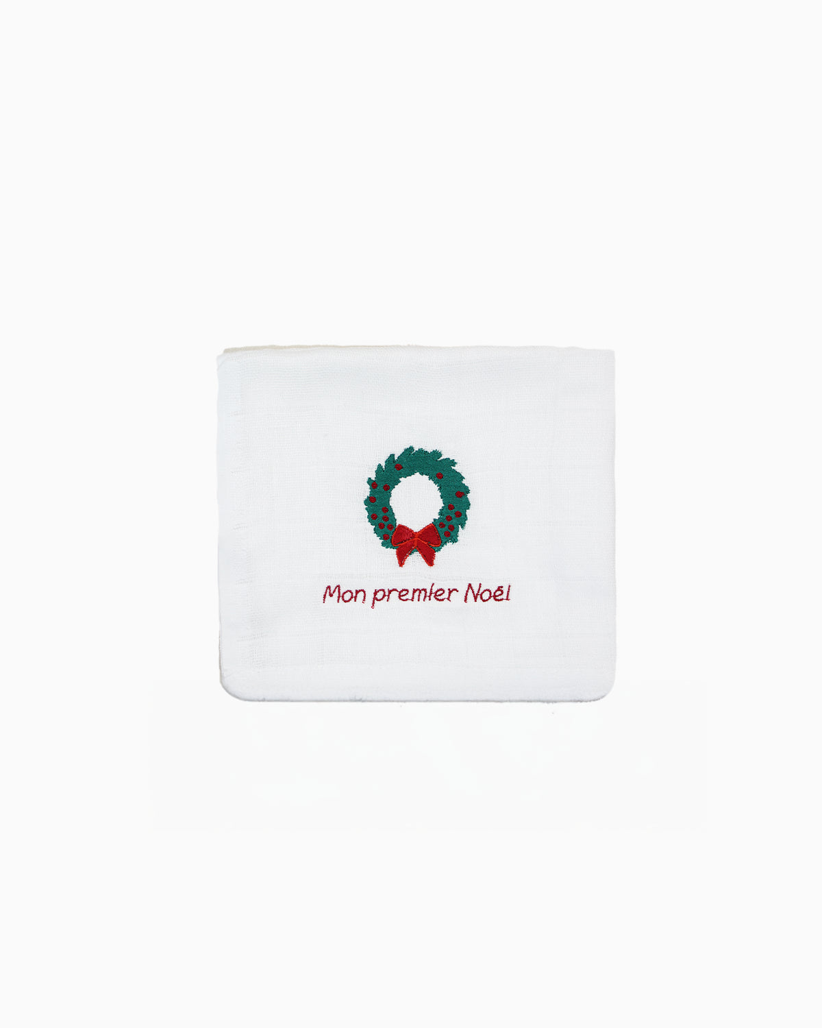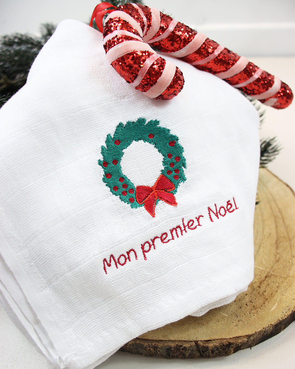 Célébrez le tout premier Noël de bébé avec notre lange brodé avec une couronne de Noël “Mon premier Noël”.