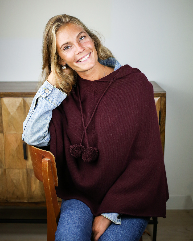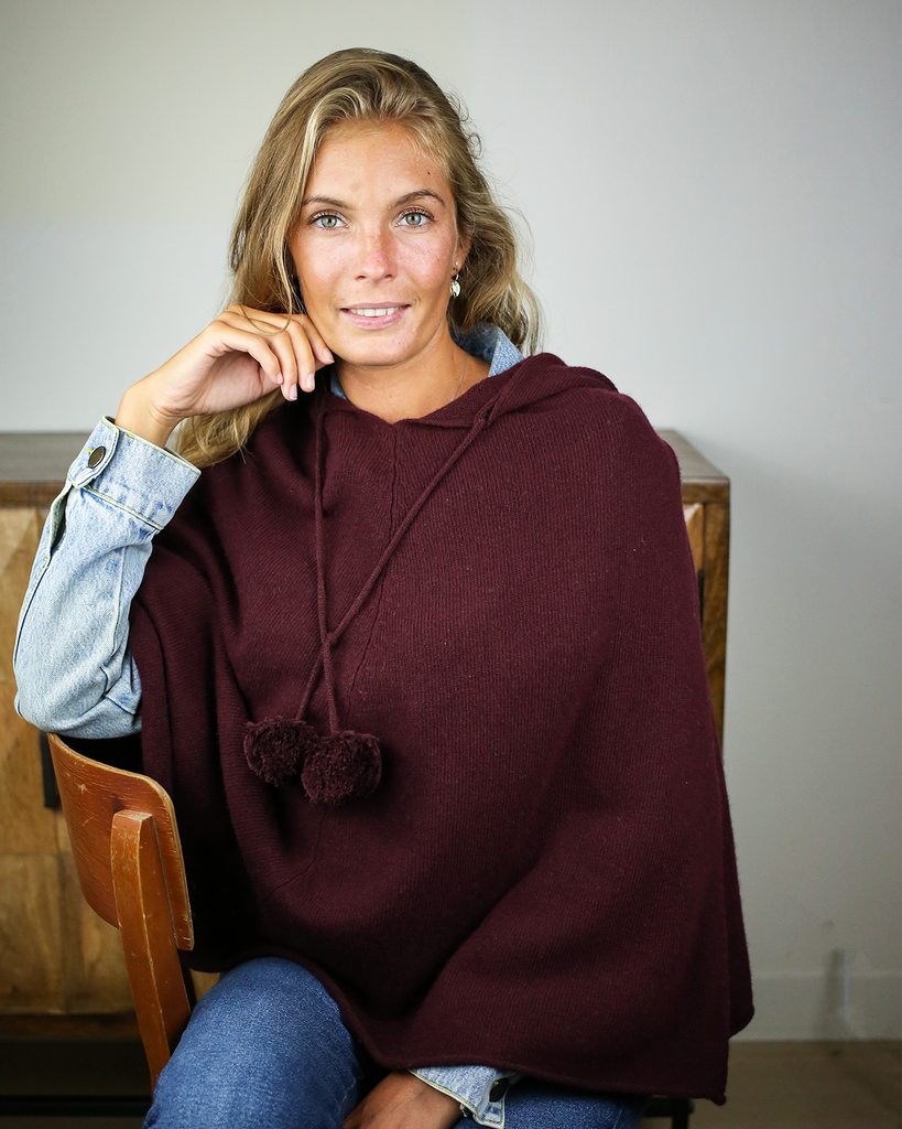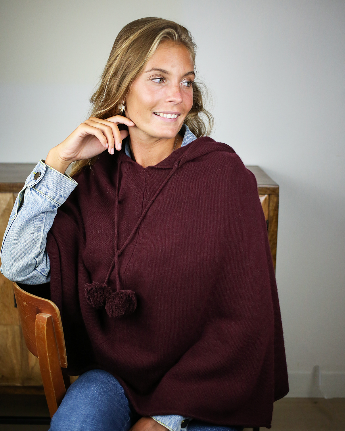 Le doux mélange de laine et cachemire vous enveloppe dans un cocon chaud et doux pour l'hiver. Le poncho est agrémenté de pompons et d'une capuche.