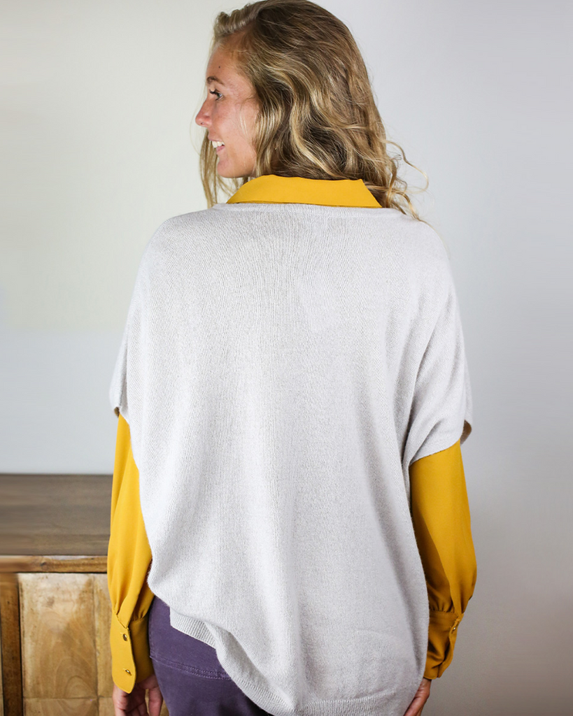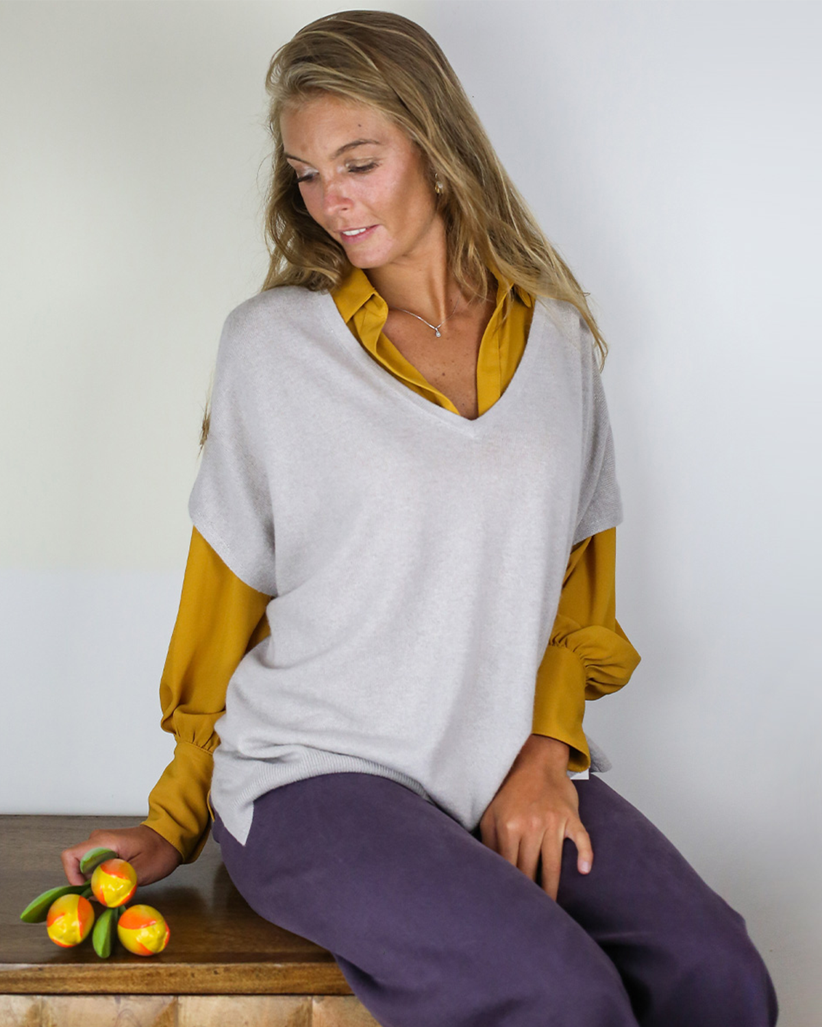Le perle cendré s'associe facilement aux pièces de votre dressing. Le pull est à manches courtes avec un col V.