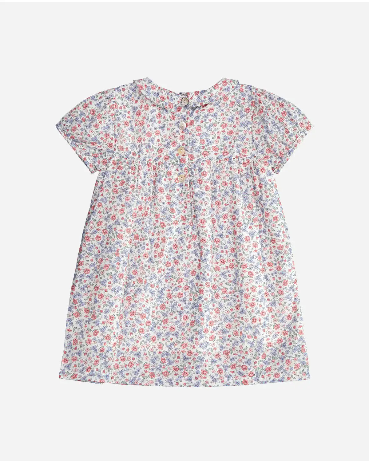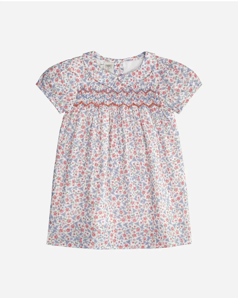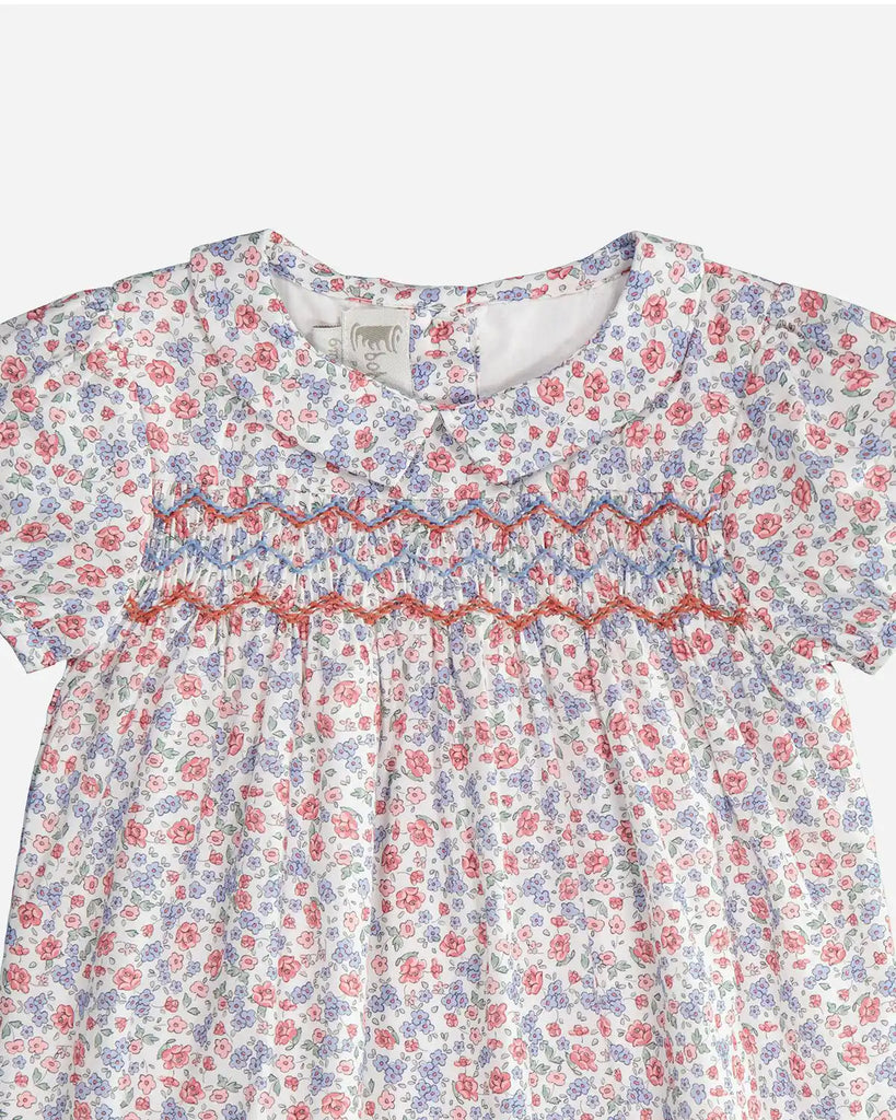 Découvrez la robe Mia en coton à imprimé à fleurs roses et bleues, une pièce irrésistible pour toutes les petites filles. Les détails tels que les manches courtes bouffantes, le col Claudine pointu et le smock délicatement bordé à l'avant, séduisent par le élégance tout en laissant place au confort.